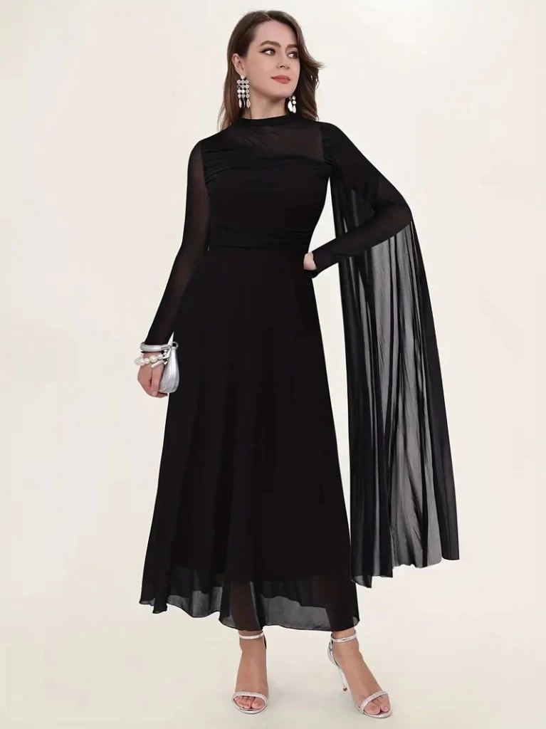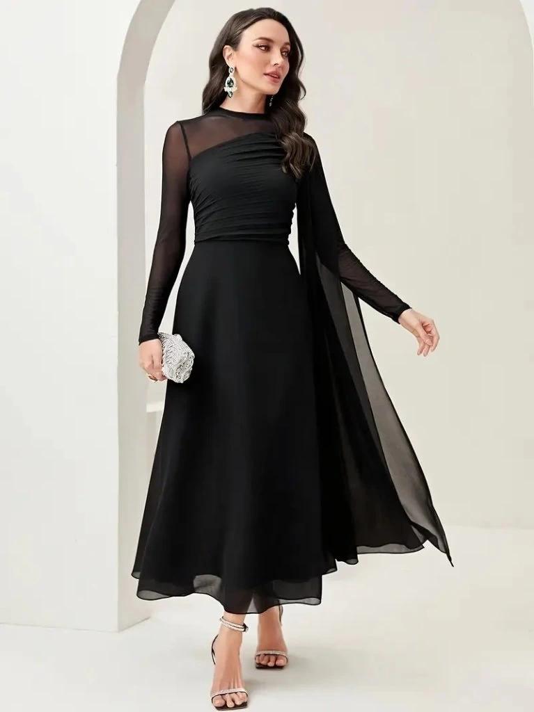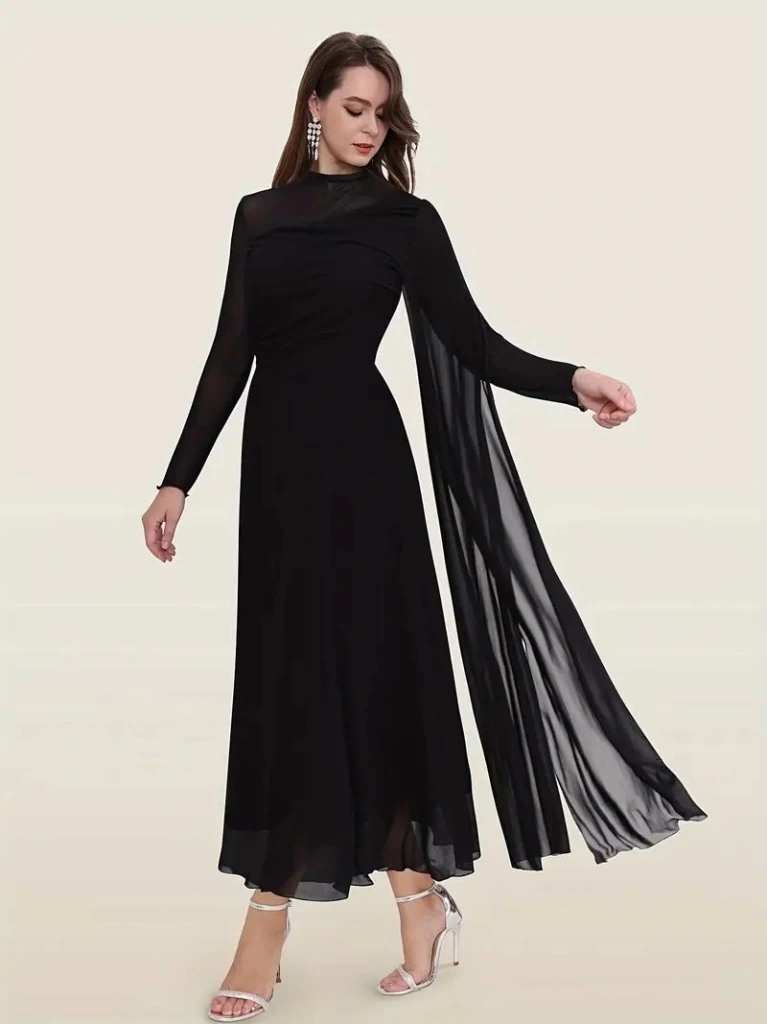 Kadın Uzun Kollu Yarı Balıkçı Yaka Tül Detaylı Uzun Sandy Elbise