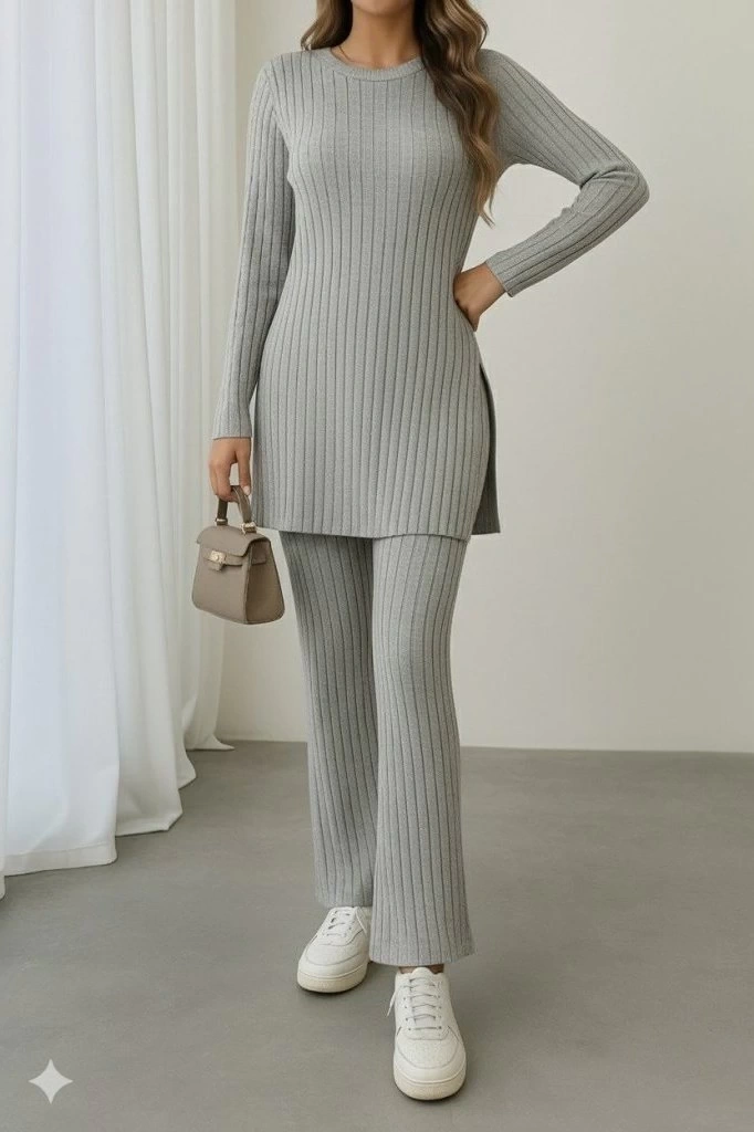 Kadın Uzun Kollu Yuvarlak Yaka Yandan Yırtmaç Detaylı şardonlu Kaşkorse Bluz Ve Pantolon Ikili Takım
