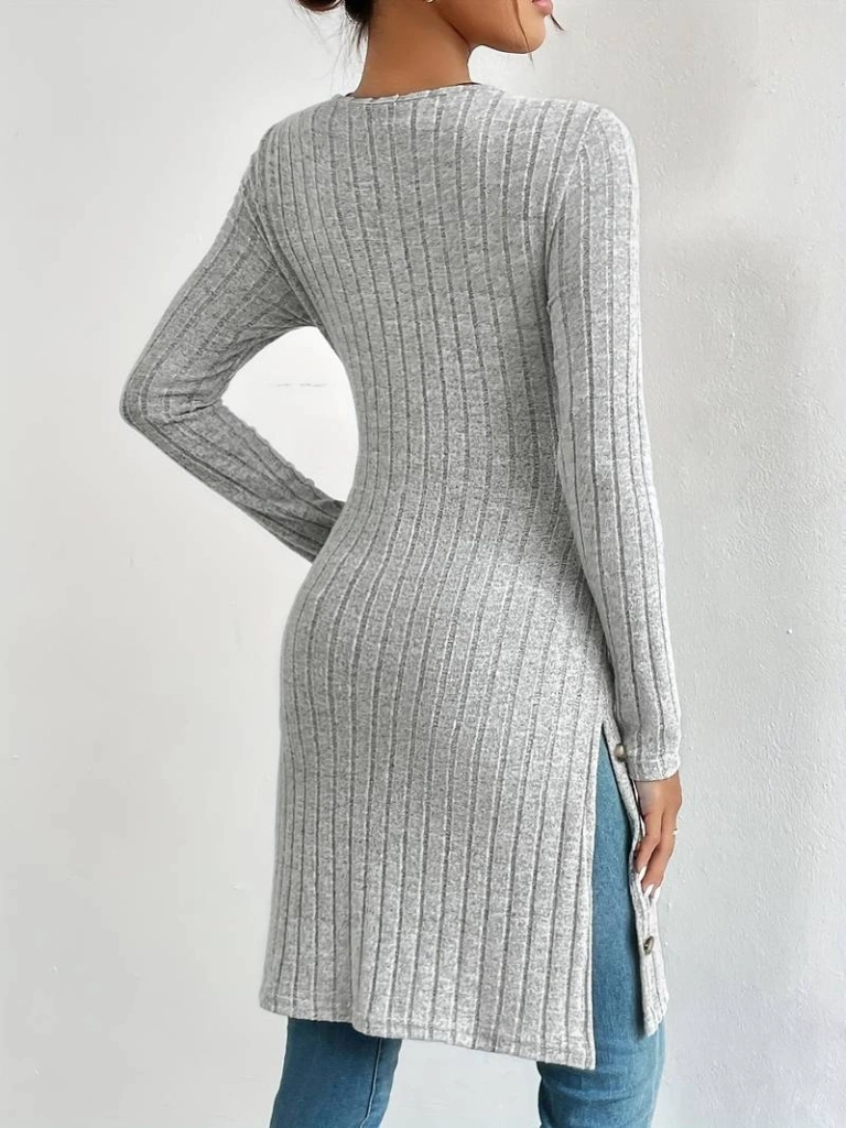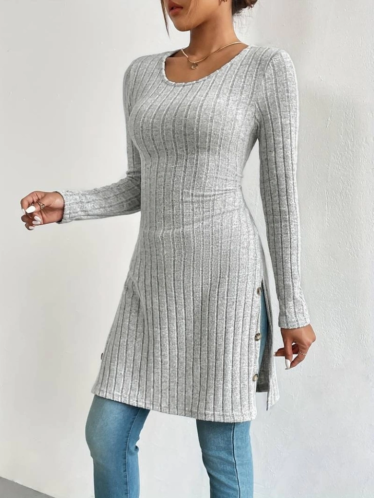 Kadın Uzun Kollu Yuvarlak Yaka Yandan Yırtmaçlı Düğmeli şardonlu Kaşkorse Bluz