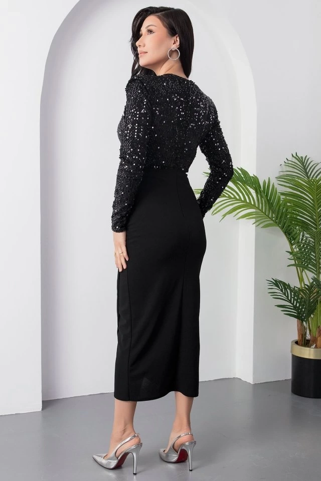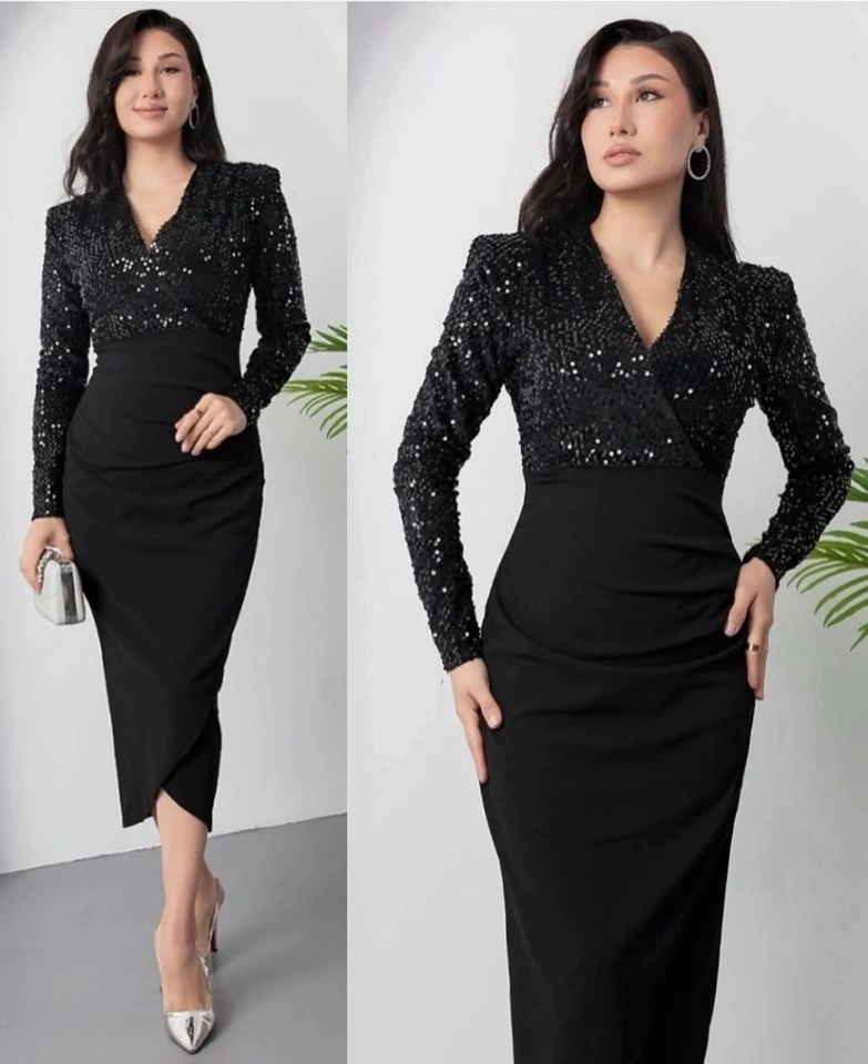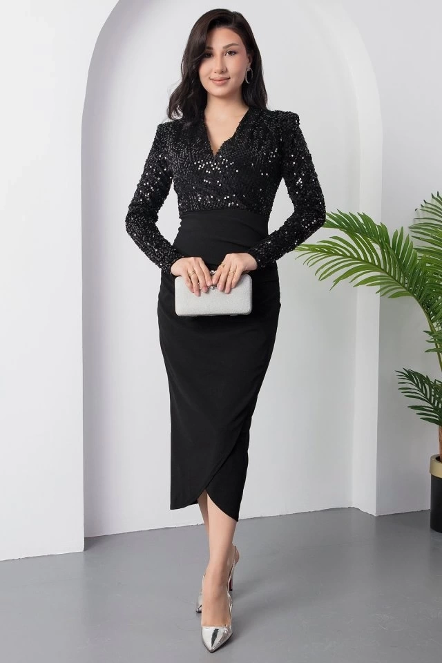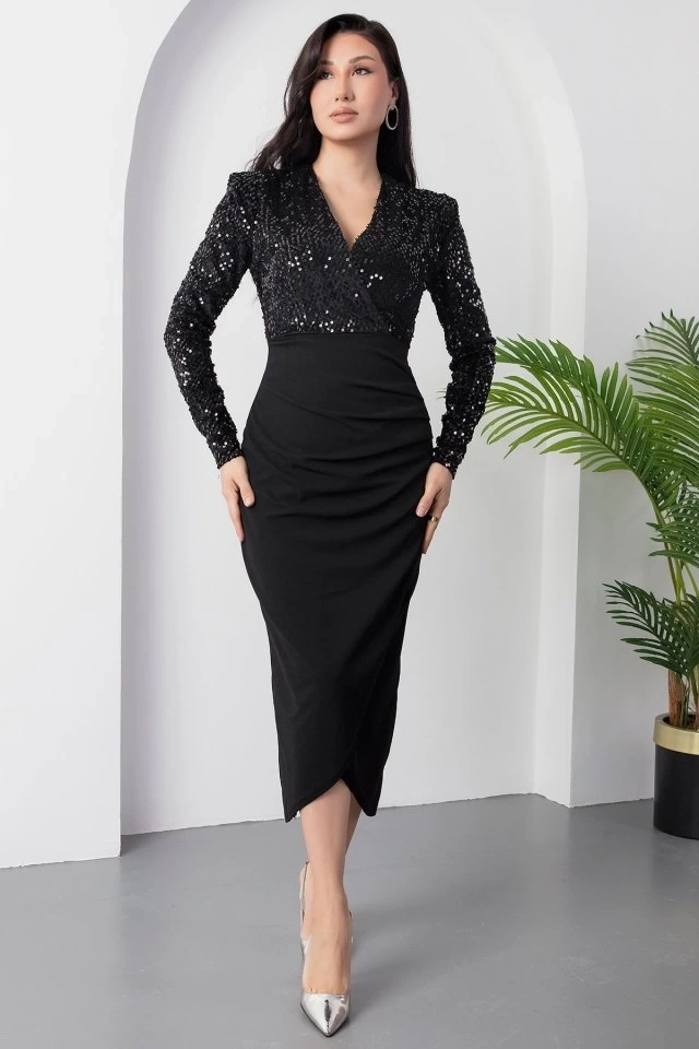 Kadın Uzun Kpllu Kruvaze Yaka Pul Pyaet Detay Midi Elbise