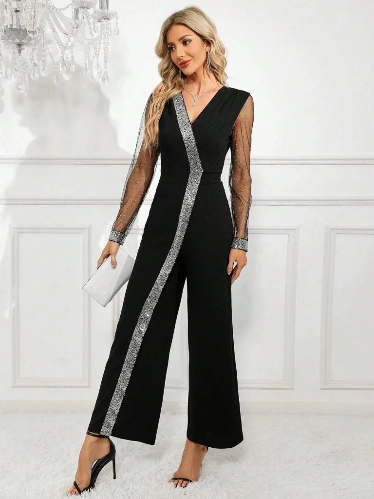 Kadın Uzun V Yakalı önden Pulpayet Detaylı Tüllü Uzun Ithal Krep Tulum