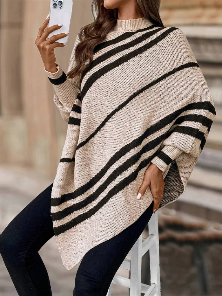 Kadın Uzun Yarasa Kollu Yüksek Boyunlu Asimetrik Kesim Triko Pelerin Kazak