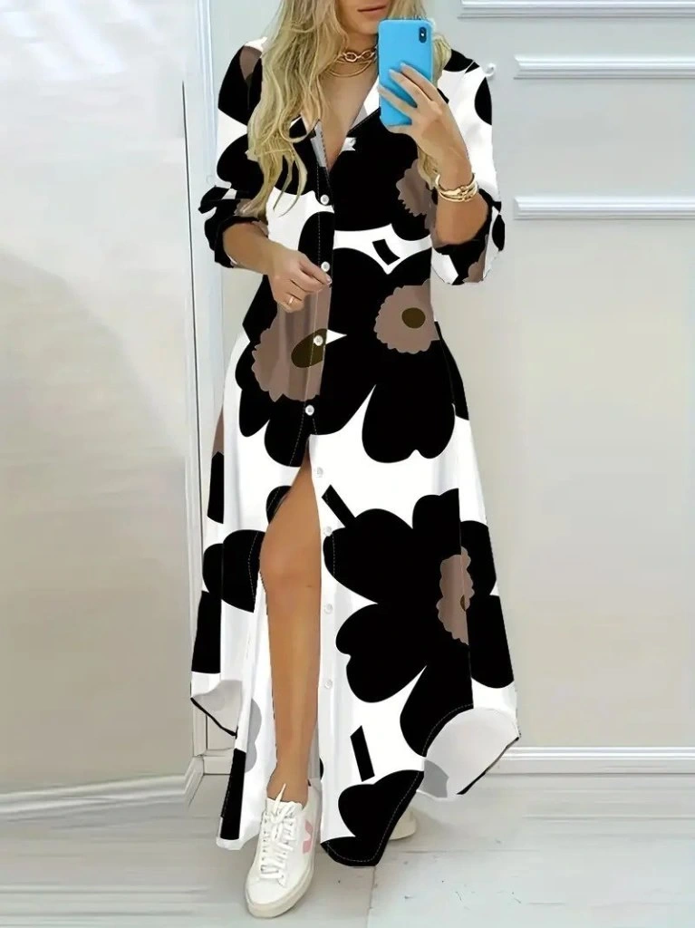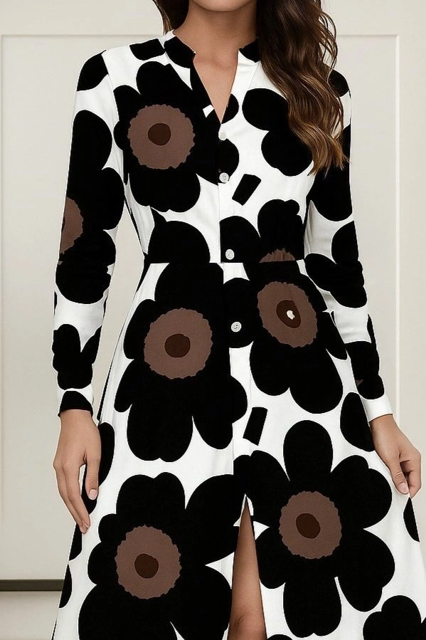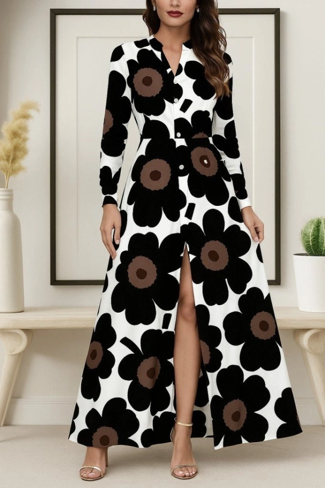 Kadın Yakalı önden Düğmeli çiçek Desenli Uzun Süprem Elbise