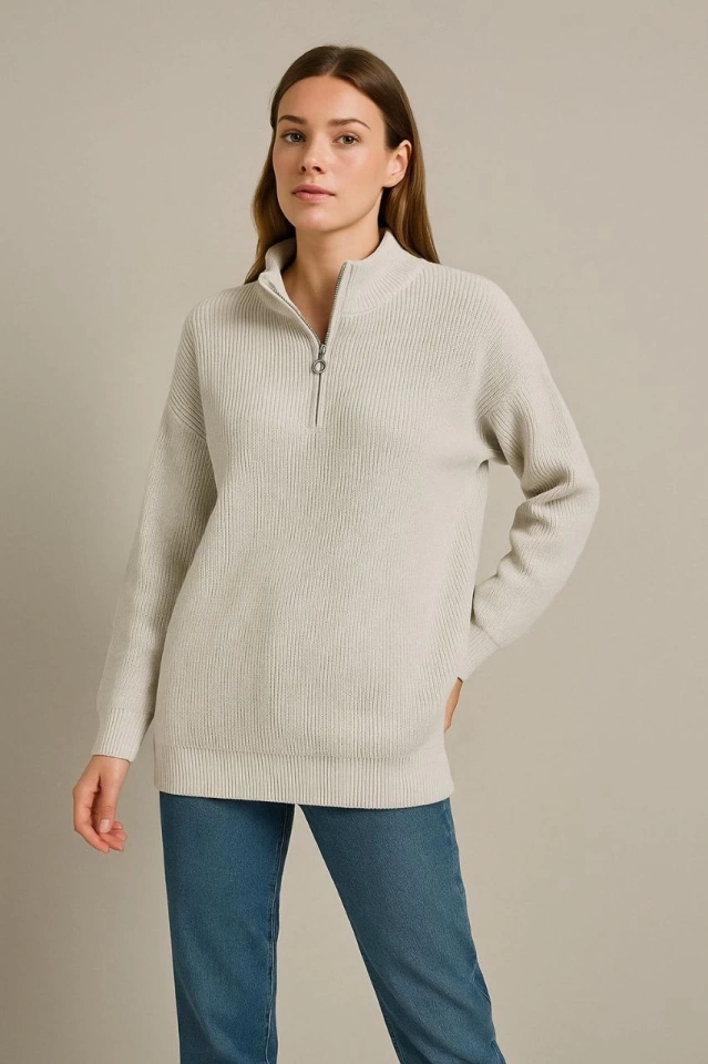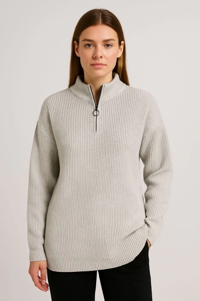 KADIN Yarım Fermuarlı Triko Kazak – Selanik Örgü, Dik Yaka, Pamuklu Dokuma, Oversize Uzun Kollu Kışlık Model - Gri
