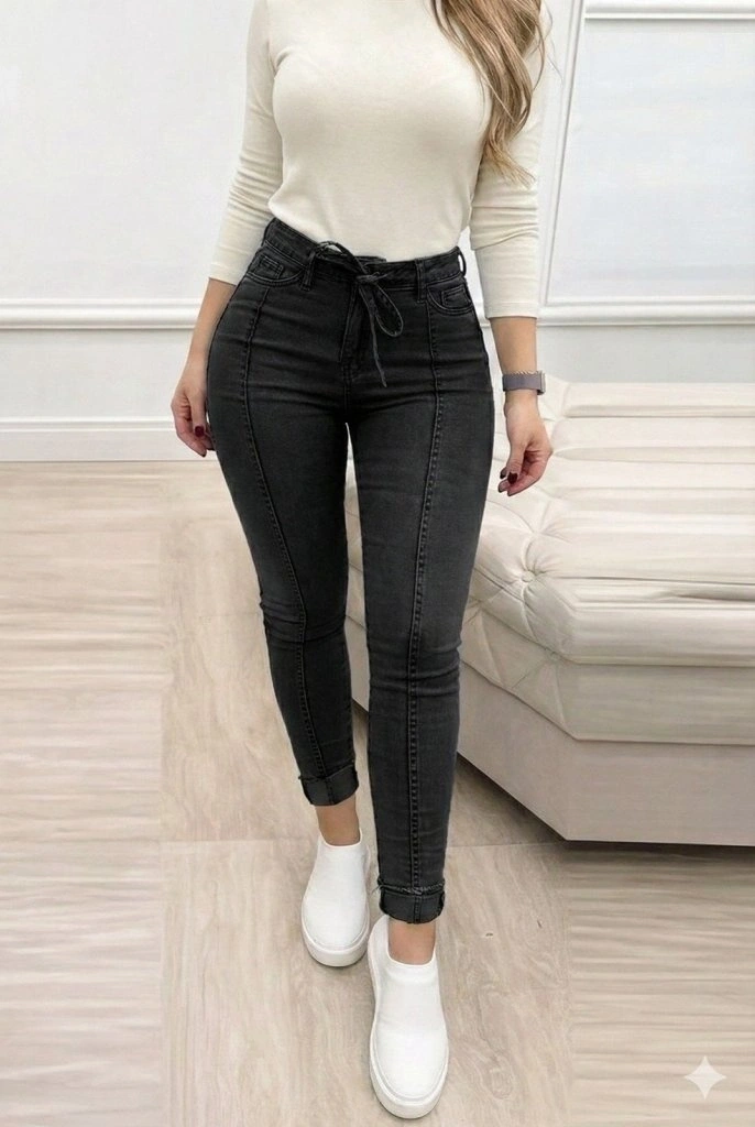 Kadın Yüksek Bel Belden Kuşaklı Yırtık Detaylı Kot Pantolon