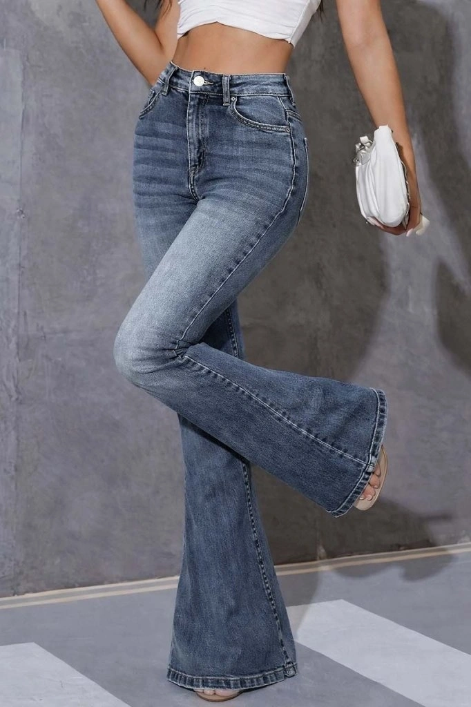 Kadın Yüksek Bel Fermuarlı İspanyol Paçalı Kot Pantolon