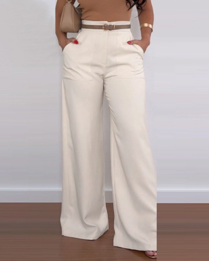 Kadın Yüksek Bel Geniş Paça Detaylı Cepli Ithal Krep Pantolon