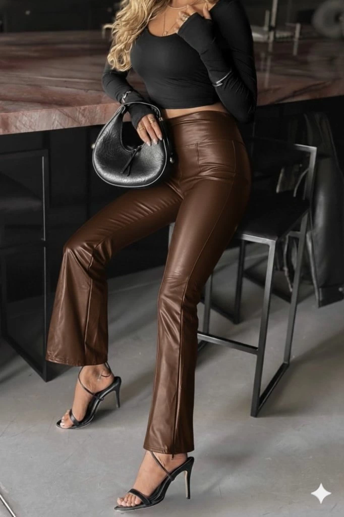 Kadın Yüksek Bel Paçaya Doğru Geniş Deri Pantolon