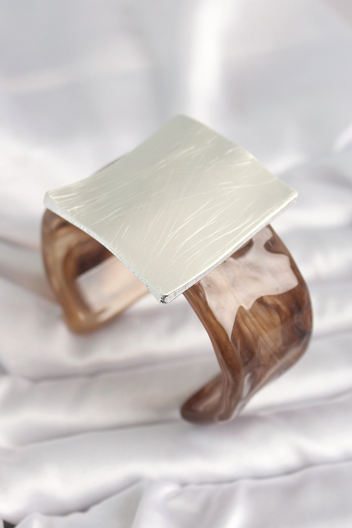 Kahverengi Mermer Desen Akrilik Plastik Gümüş Kare Plaka Model Vintage Kadın Bilezik