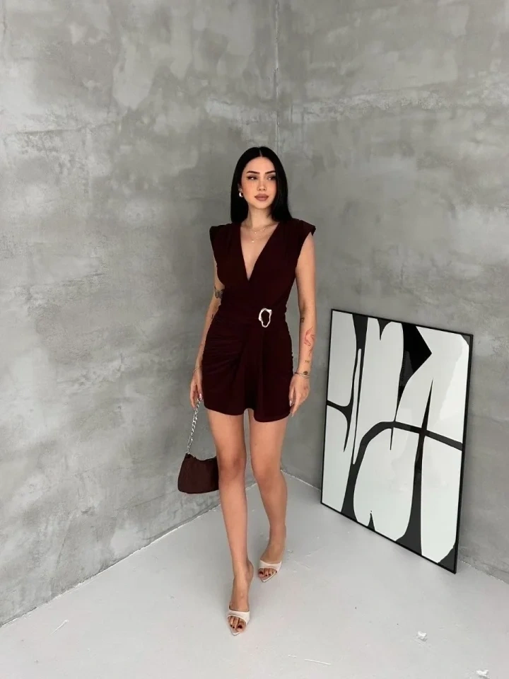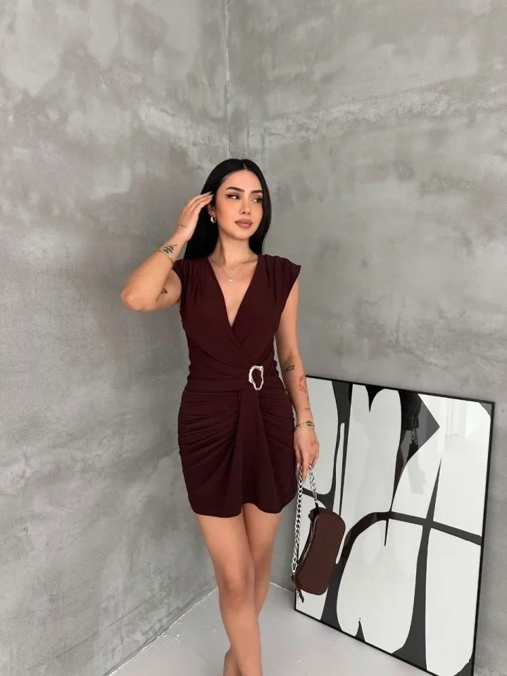 Kruvaze Drapeli Tokalı Mini Elbise Şık Gece Davet Abiye - Kahverengi