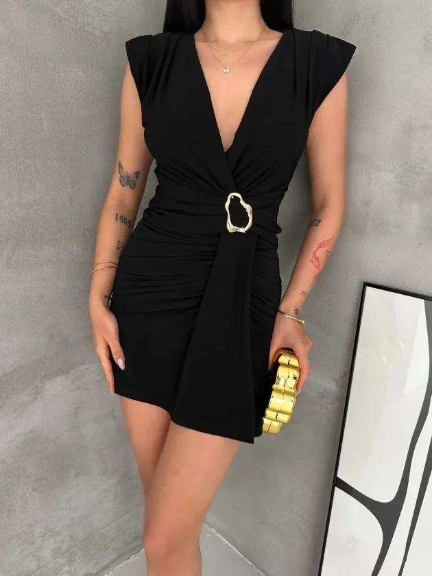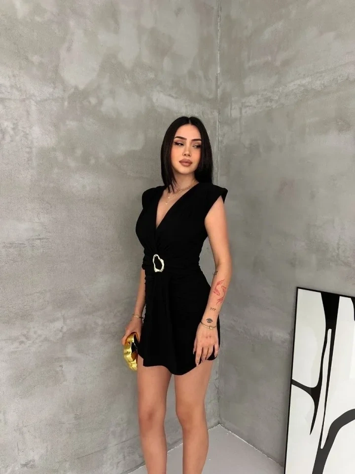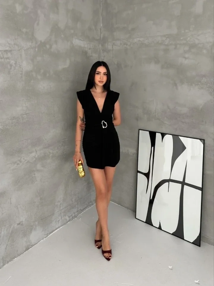 Kruvaze Drapeli Tokalı Mini Elbise Şık Gece Davet Abiye - Siyah