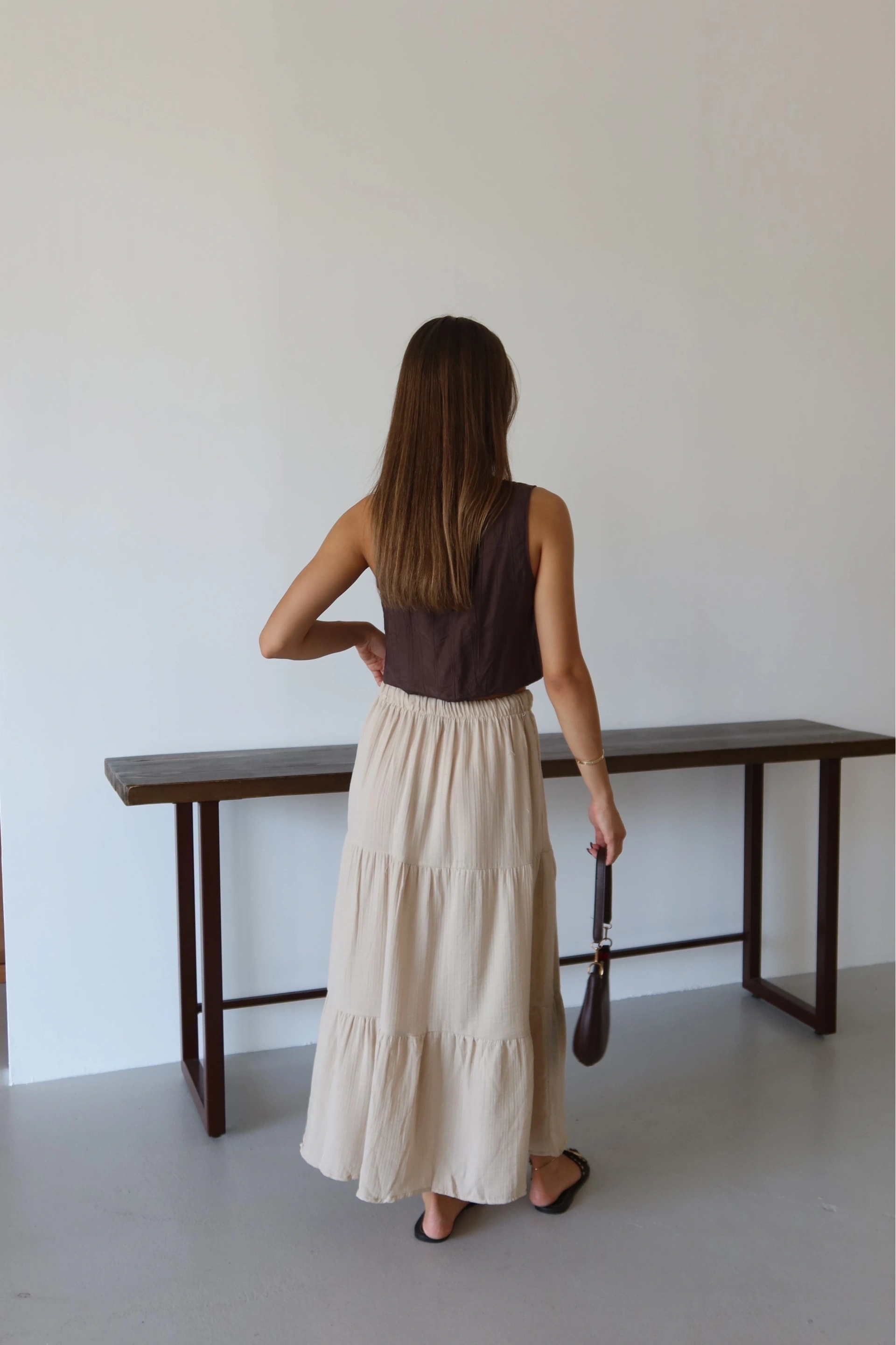 Yumuşak dokulu müslin kumaş ile tasarlanmış olan bu şık uzun etek, gardırobunuzun favori parçalarından biri olmaya aday. Hem şıklığı hem de rahatlığı bir arada sunan bej rengi, her tarza kolaylıkla uyum sağlar. Keten kumaşın sağladığı hafiflik ve doğal görünüm, yaz aylarında tercih edebileceğiniz ideal bir parça haline getiriyor.