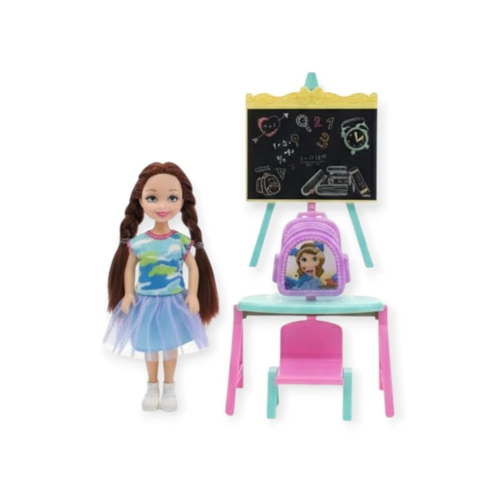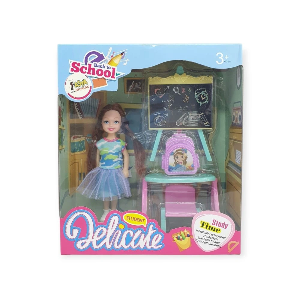 Öğrenme Zamanı - Okul Oyun Seti - A8-21 - Esmer Set içerisinde 1 adet bebek , 1 adet masa-sıra , 1 adet yazı tahtası ve 1 adet çanta bulunmaktadır. Bebek 14 cm boyutundadır. Bebeğin kafa kısmı et , kalan kısımlar sert plastik malzemeden üretilmiştir. Kaliteli plastik malzemeden üretilmiştir.