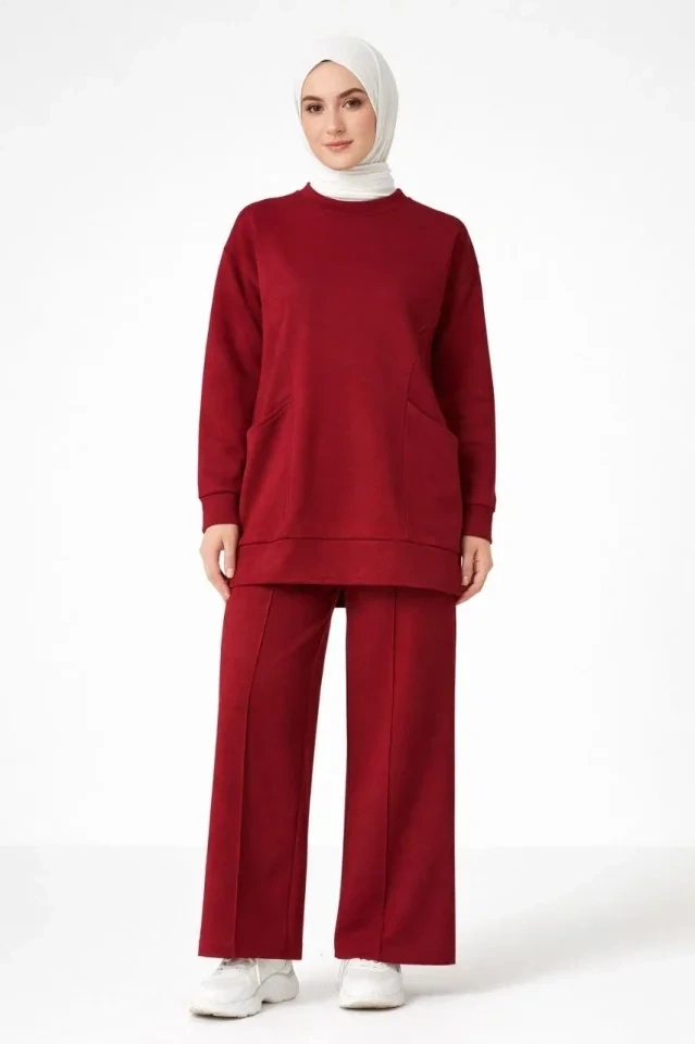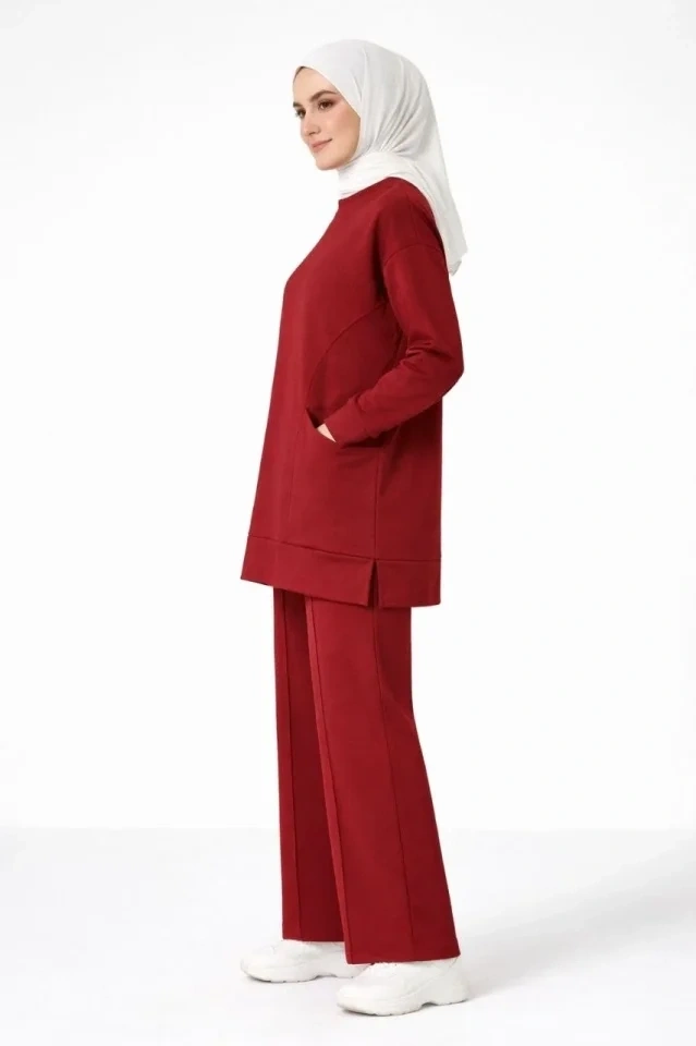 Osy Modal Yumuşak Dokulu Kumaş Tesettür Cepli Tunik Pantolon Takım - Bordo