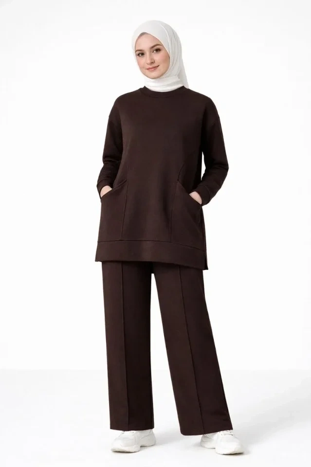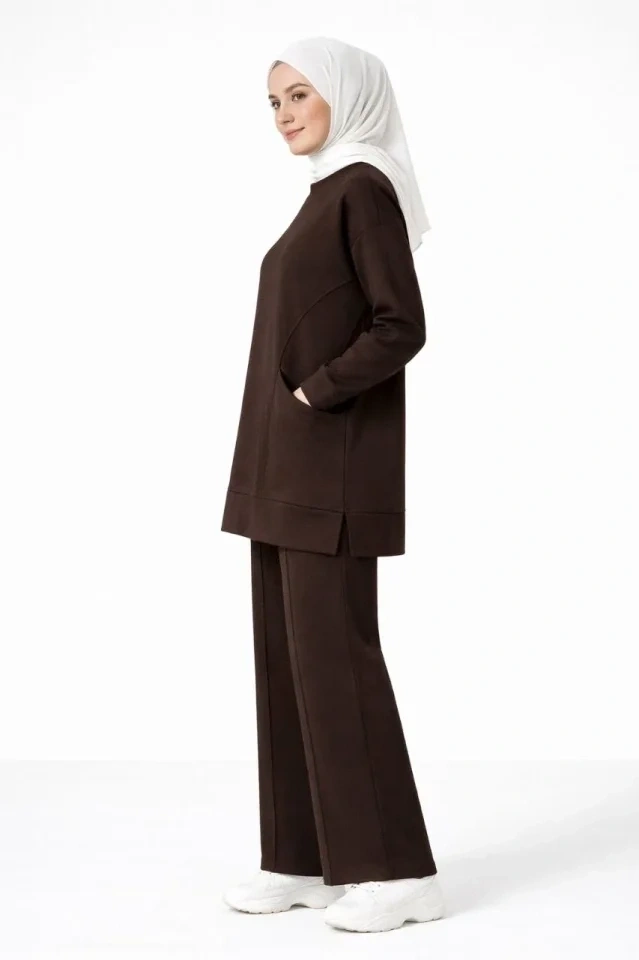 Osy Modal Yumuşak Dokulu Kumaş Tesettür Cepli Tunik Pantolon Takım - Kahverengi
