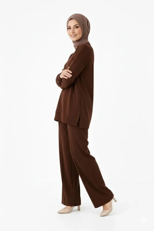 Osy Modal Yumuşak Dokulu Tesettür İkili Takım Yan Yırtmaçlı Uzun Tunik Ve Düz Paça Pantolon, Salaş Kalıp - Kahverengi