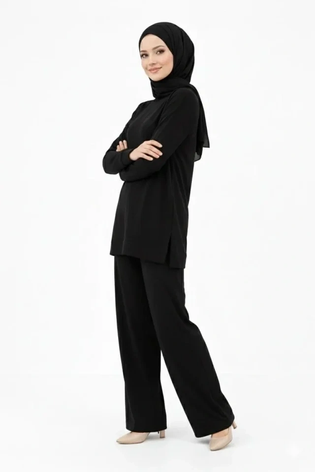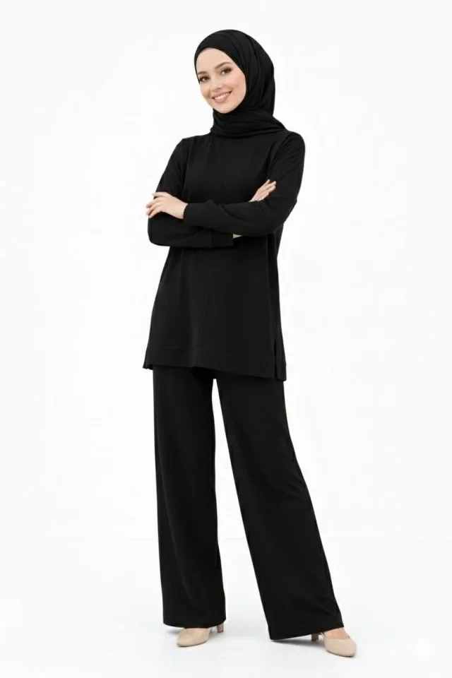 Osy Modal Yumuşak Dokulu Tesettür İkili Takım Yan Yırtmaçlı Uzun Tunik Ve Düz Paça Pantolon, Salaş Kalıp - Siyah