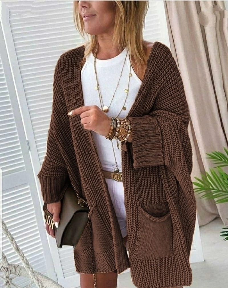 Oversize Kalıp Cepli Salaş Triko Hırka Kahve