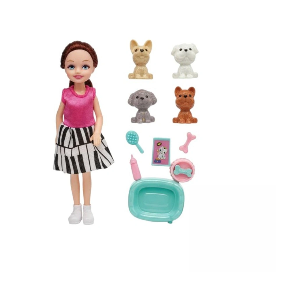 Pet Shop - Bebekli Köpek Bakım Seti - 7722-3 - Esmer Paket içerisinde 1 adet bebek , 4 adet köpek figürü ve 6 adet bakım seti aksesuarı bulunmaktadır. Bebek 15 cm , köpekler 3 cm boyutundadır. Bebeğin kafa , kol ve bacak kısımları hareketlidir. Kaliteli plastik malzemeden üretilmiştir.