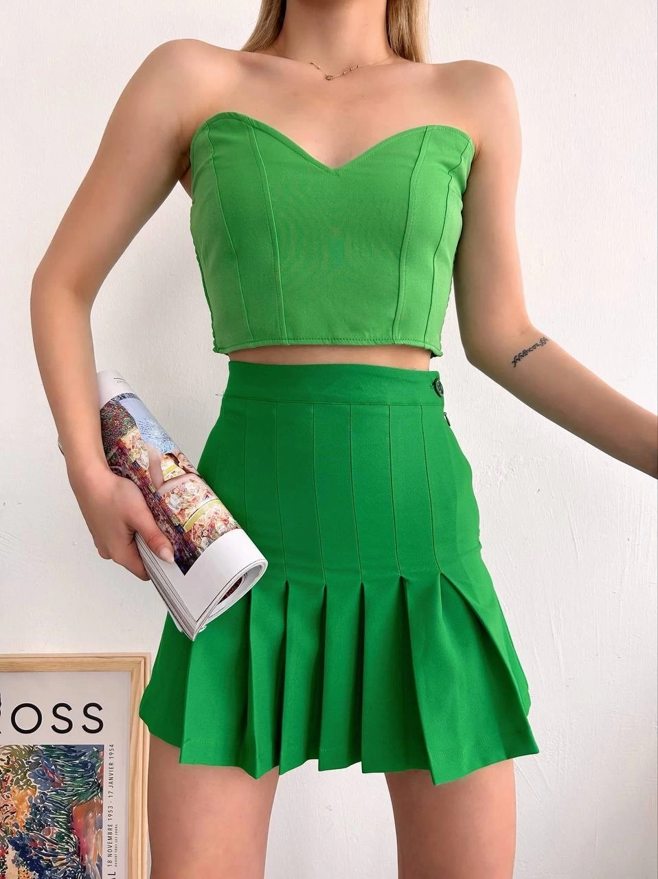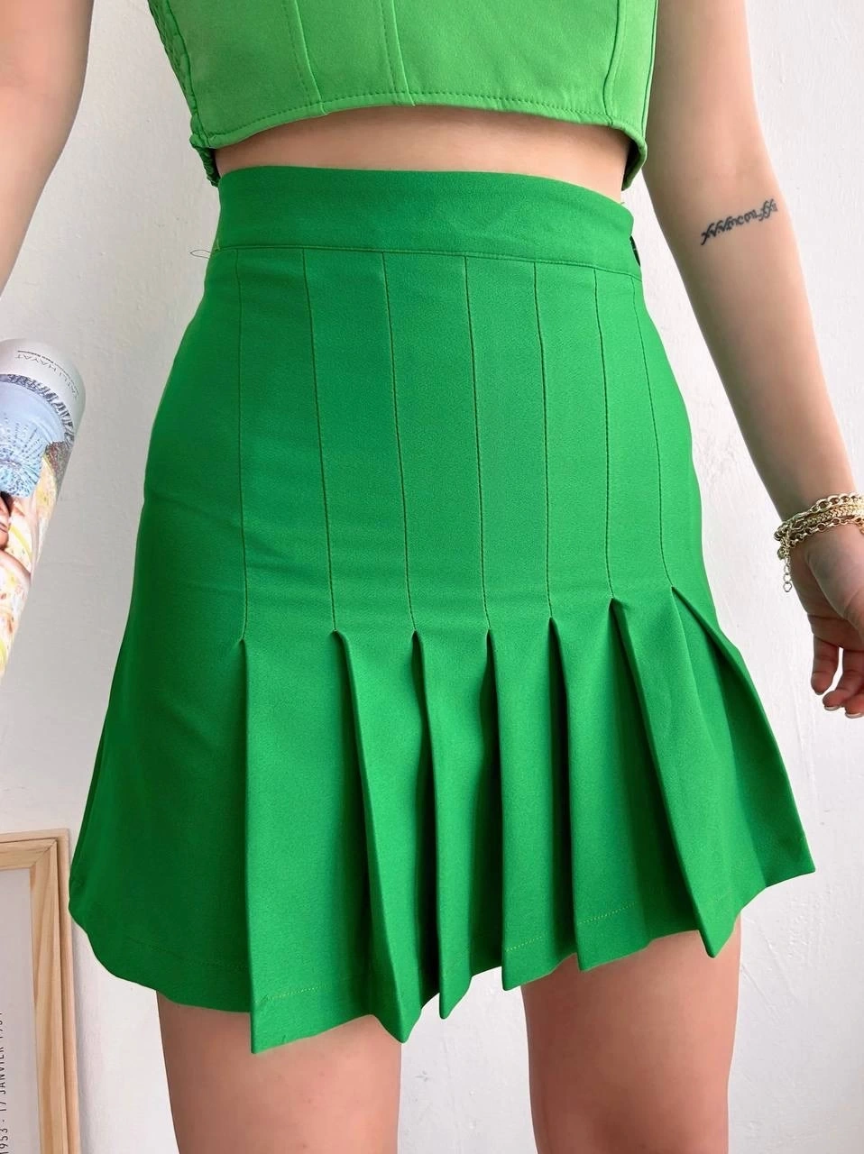 Pileli düğmeli etek açık yeşil s24811--Şık ve zarif bir görünüm elde etmek isteyen kadınlar için ideal bir seçim olan Pileli Düğmeli Etek, gardırobunuzun vazgeçilmez parçalarından biri olmaya aday. Açık yeşil rengi ile doğanın tazeliğini yansıtan bu etek, her mevsim kolaylıkla kombinlenebilir özelliğiyle dikkat çekiyor. Pileli tasarımıyla hareket katan etek, vücuda uyumlu kesimi sayesinde şıklık ve rahatlığı bir arada sunuyor. Düğme detaylarıyla modern bir hava katan bu eteği günlük hayatta ya da özel davetlerde rahatlıkla kullanabilir, tarzınızı ön plana çıkarabilirsiniz. Kumaş: %100 polyester Renk: Açık Yeşil Kemer detayı bulunmaktadır. Belinde lastikli ve ayarlanabilir tasarımı sayesinde kolayca giyilebilir. Standart beden olup, S/M/L gibi seçenekleri bulunmaktadır.