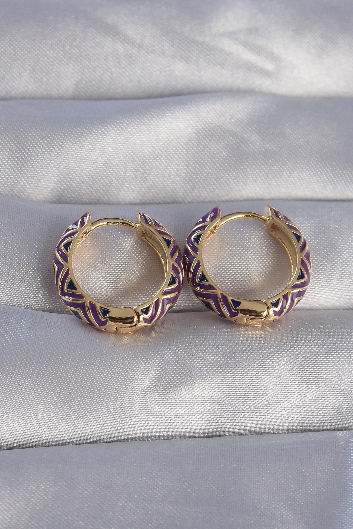Pirinç Gold Renk Mor Etnik Desenli Halka Küpe