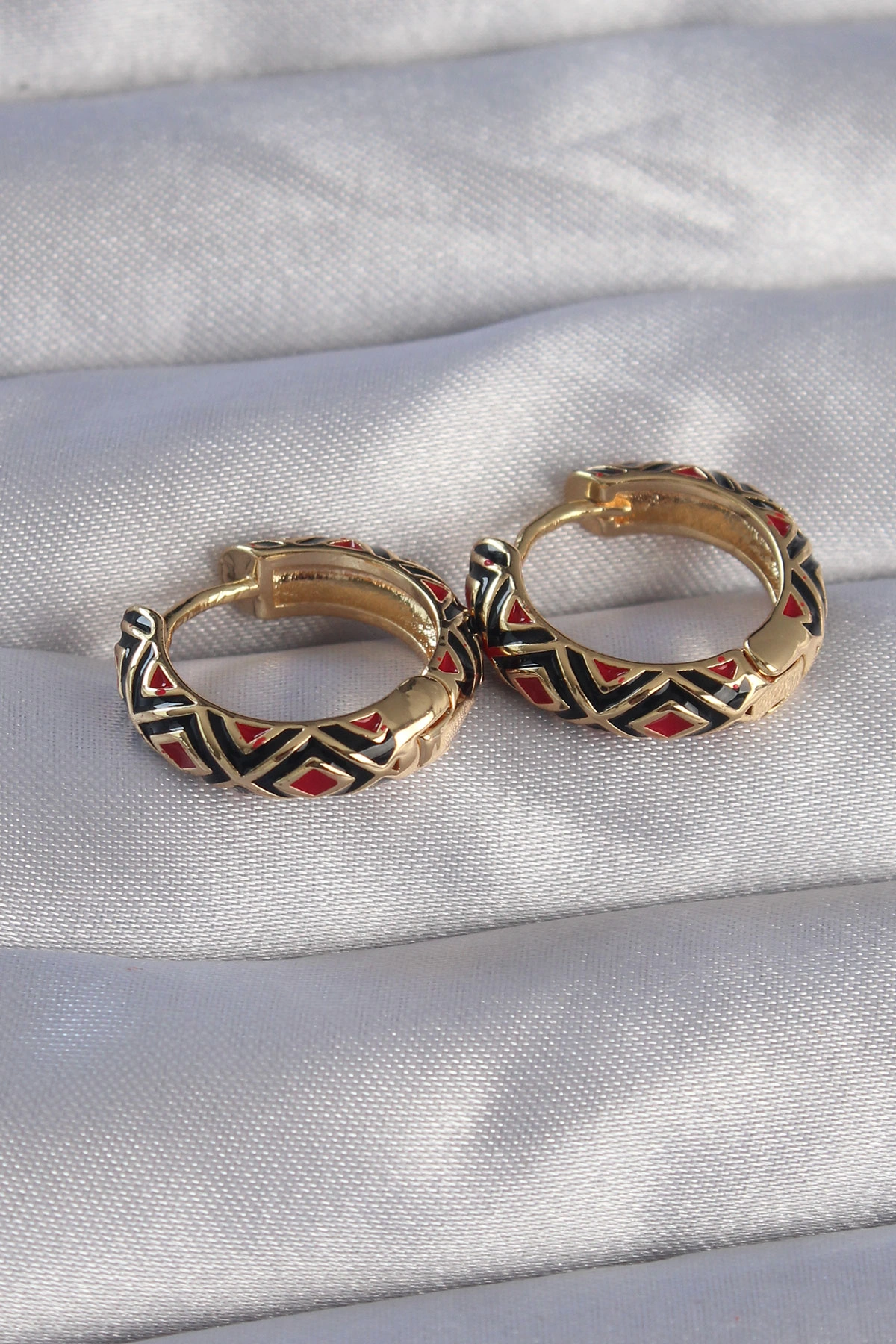Pirinç Gold Renk Siyah Etnik Desenli Halka Küpe