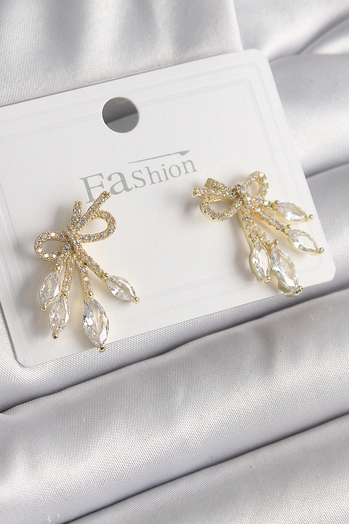 Pirinç Gold Renk Zirkon Taşlı Düğüm Model Damla Zirkon Taşlı Kadın Küpe