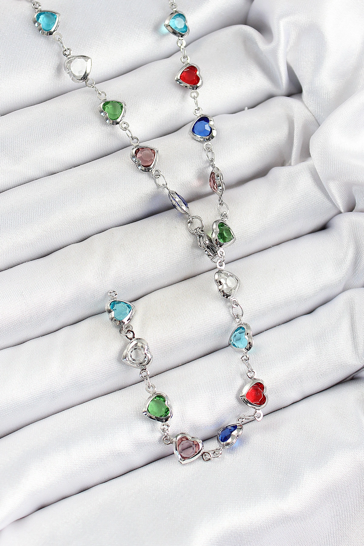 Pirinç Gümüş Renk Karışık Renk Zirkon Taşlı Kalpli Y Kadın Kolye