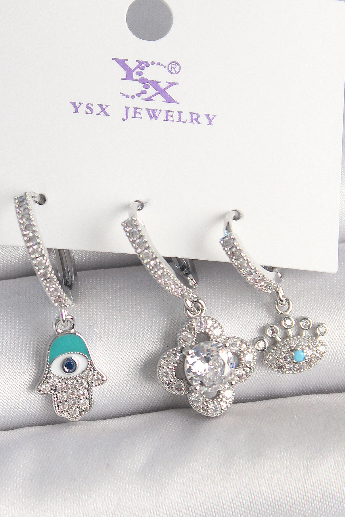 Pirinç Gümüş Renk Zirkon Taşlı Fatma Ana Yonca Figür Göz Detay 3'Lü Kadın Kombin Küpe