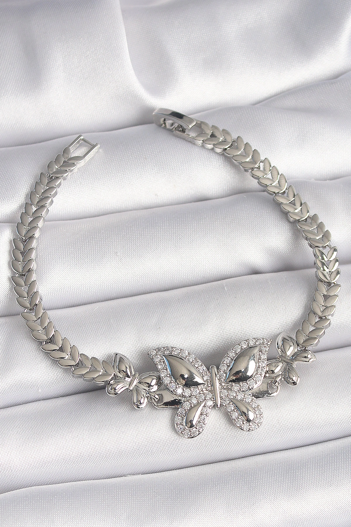 Pirinç Gümüş Renk Zirkon Taşlı Kelebek Model Kadın Bileklik