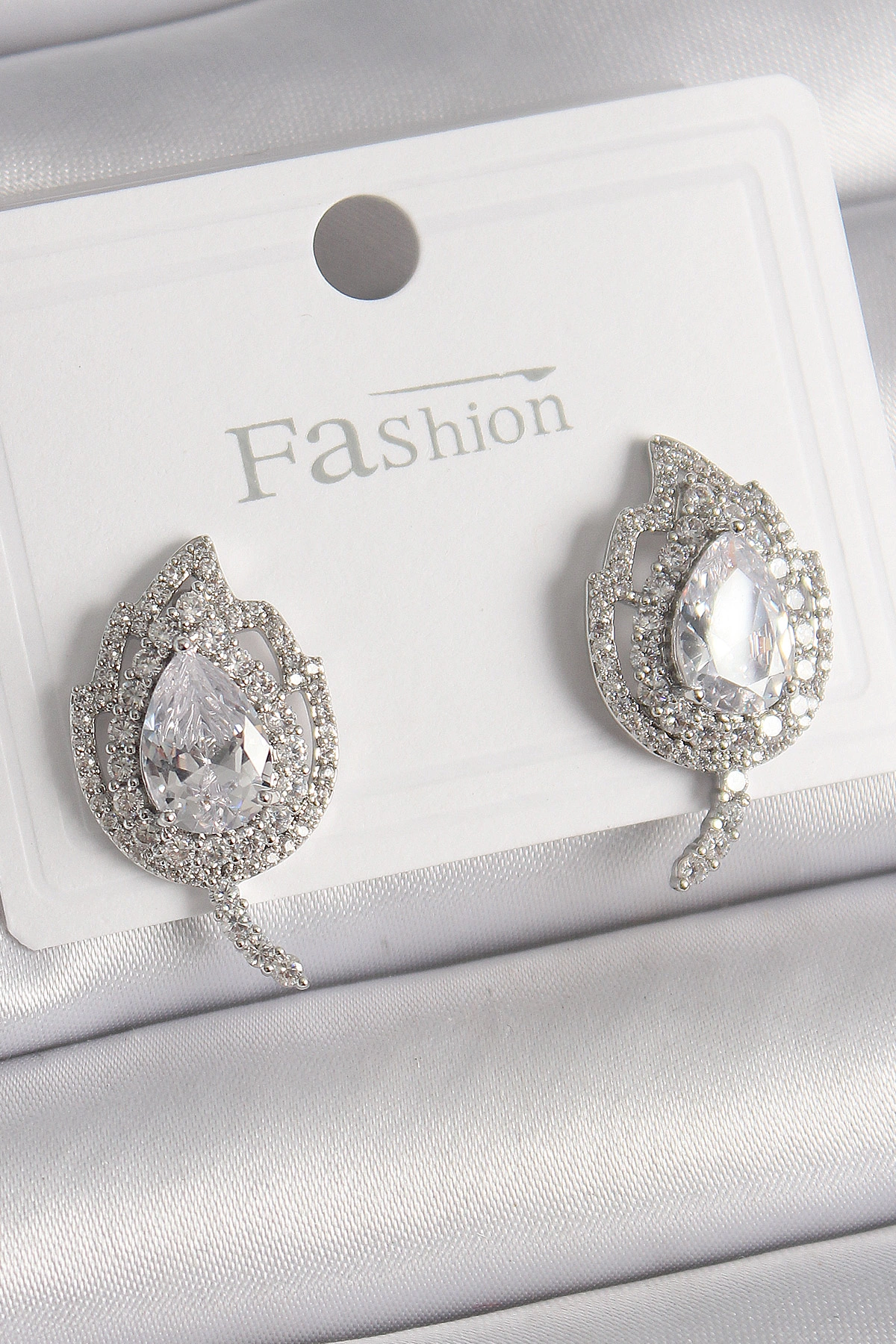 Pirinç Gümüş Renk Zirkon Taşlı Yaprak Model Kadın Küpe