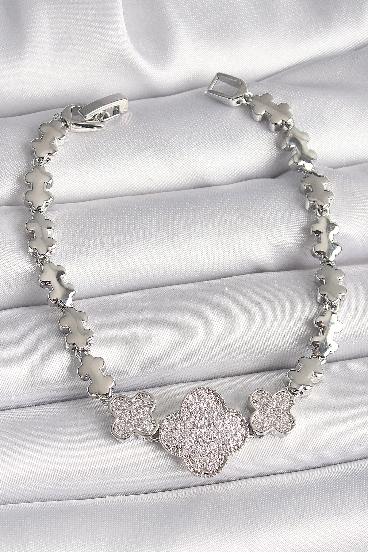 Pirinç Gümüş Renk Zirkon Taşlı Yonca Model Zincir Model Kadın Bileklik
