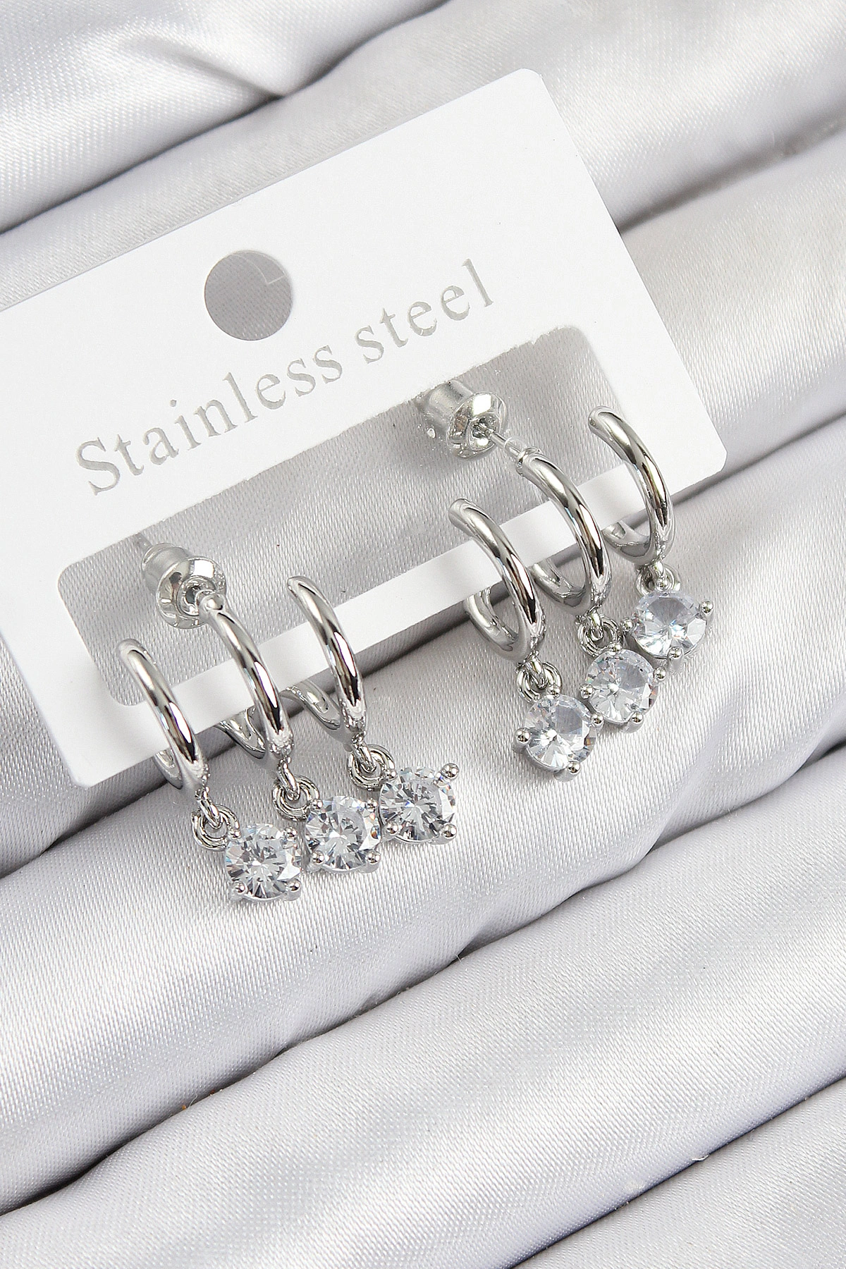 Pirinç Sallantılı Zirkon Taşlı Model Gümüş Renk Kadın Küpe