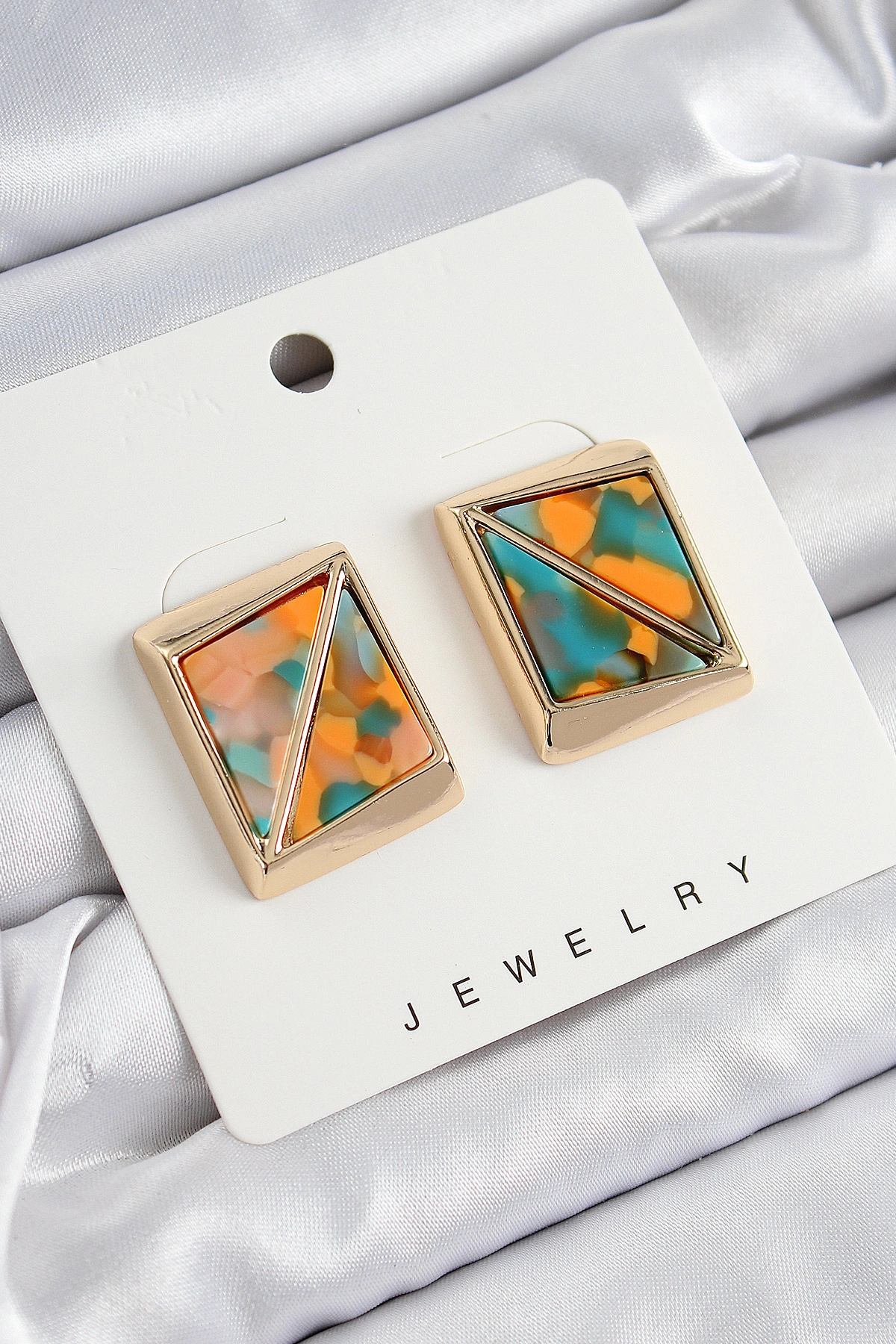 Pirinç Turuncu Yeşil Üçgen Kesim Detaylı Kare Model Vintage Gold Renk Kadın Küpe
