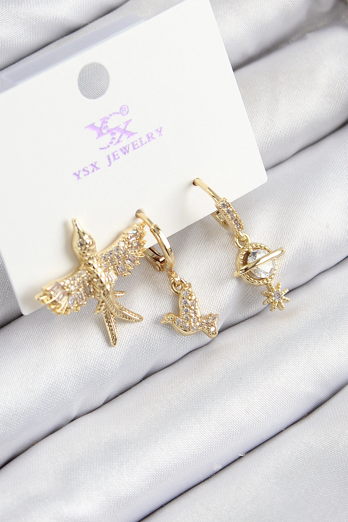 Pirinç Zirkon Taşlı 3'lü Kuş Model Gold Renk Kadın Küpe