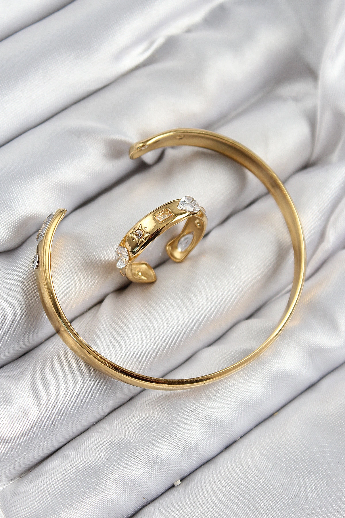 Pirinç Zirkon Taşlı Ayrık Model Gold Renk Bileklik Yüzük Set