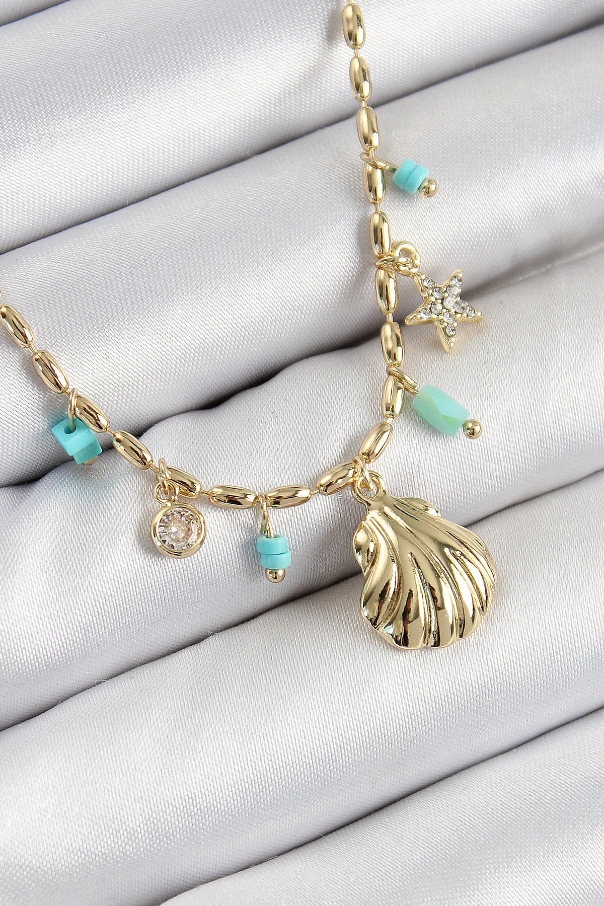 Pirinç Zirkon Taşlı Deniz Kabuğu Model Gold Renk Kadın Kolye