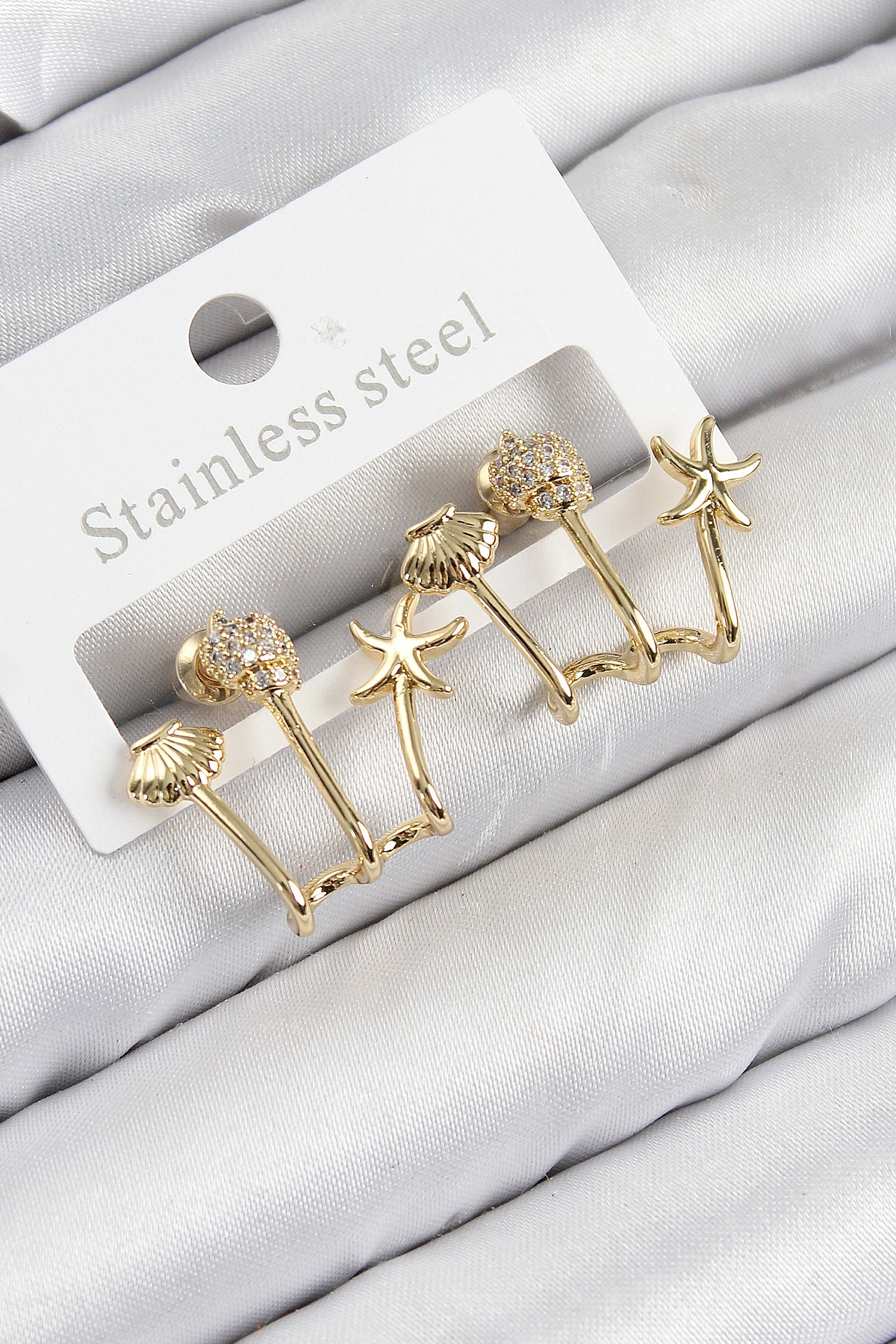 Pirinç Zirkon Taşlı Deniz Yıldızı ve İstiridye Model Gold Renk Kadın Küpe