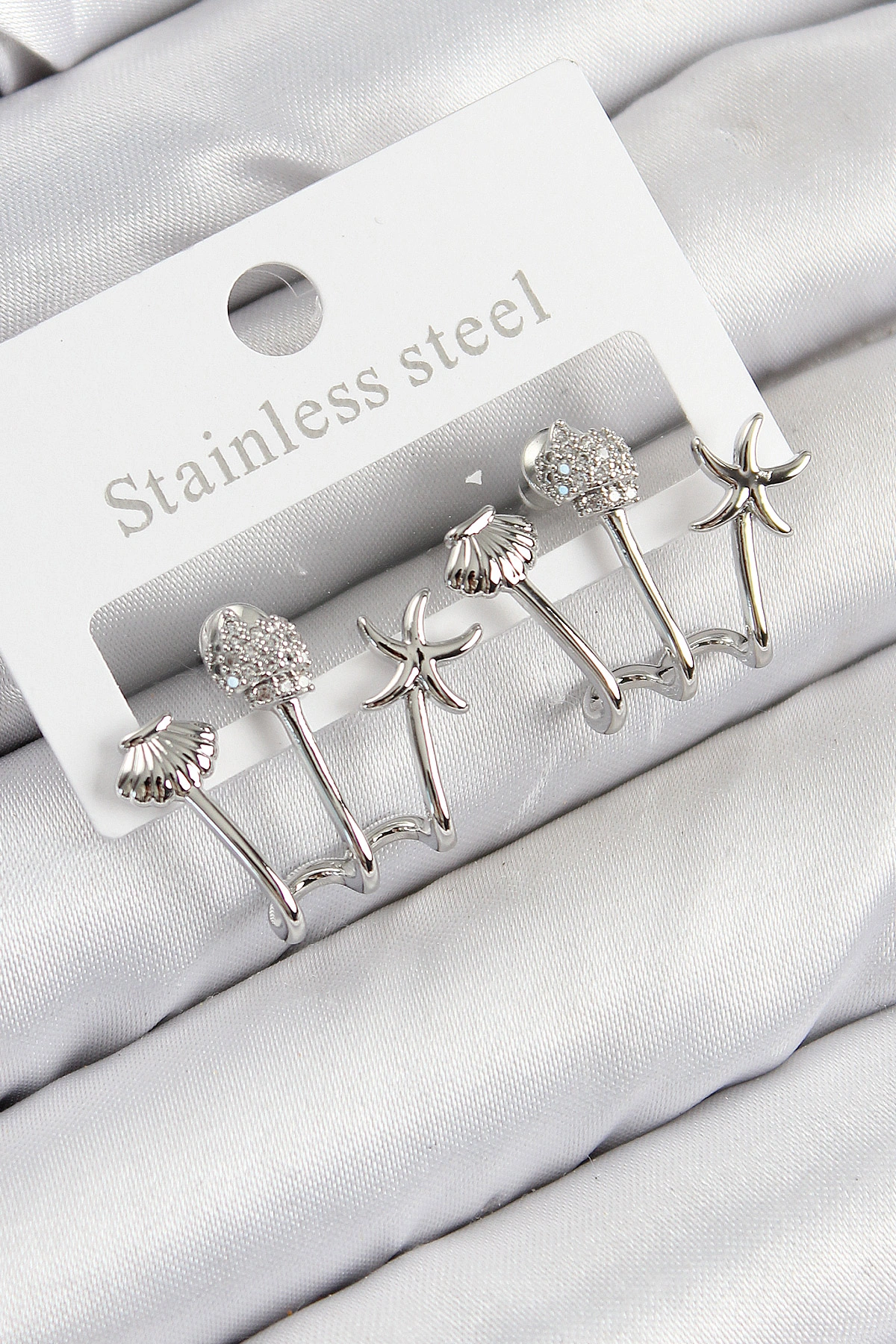 Pirinç Zirkon Taşlı Deniz Yıldızı ve İstiridye Model Gümüş Renk Kadın Küpe