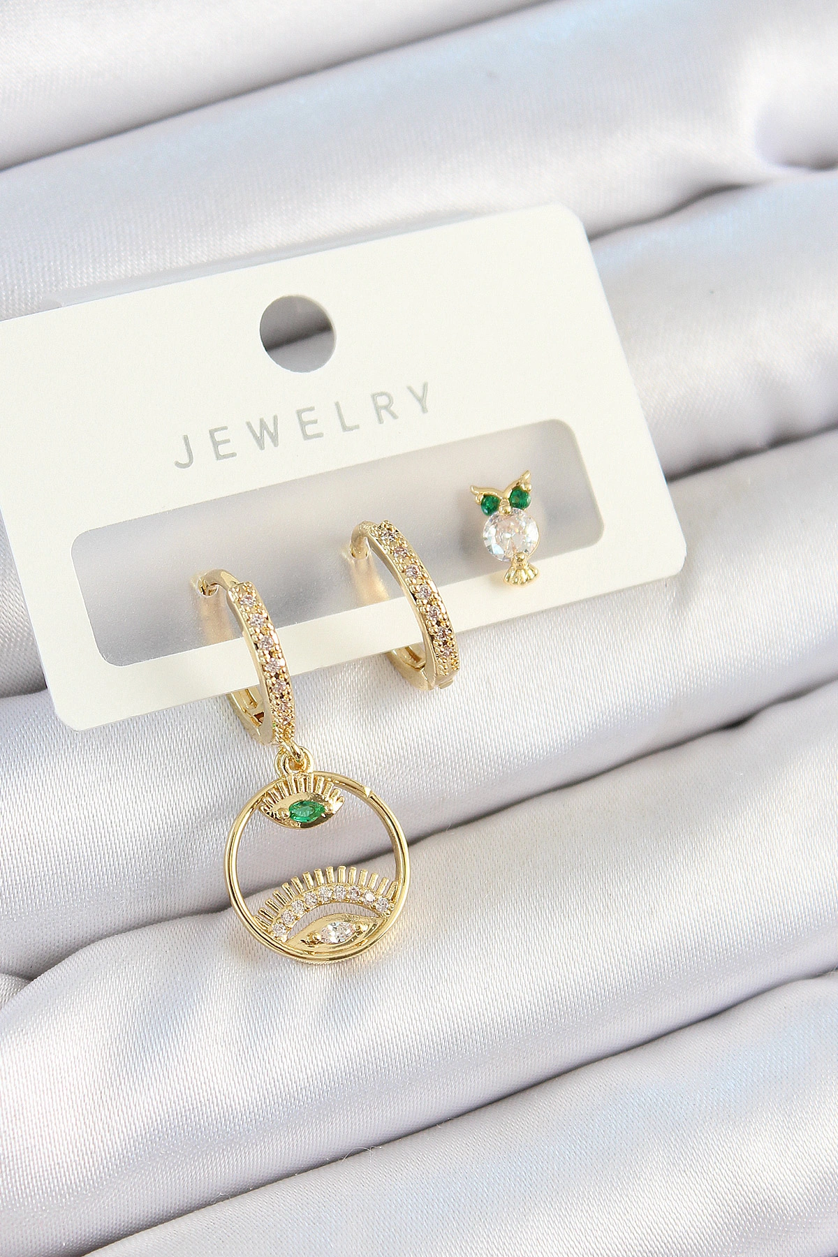 Pirinç Zirkon Taşlı Göz Ve Baykuş Model Gold Renk 3'lü Çift Kadın Küpe Set