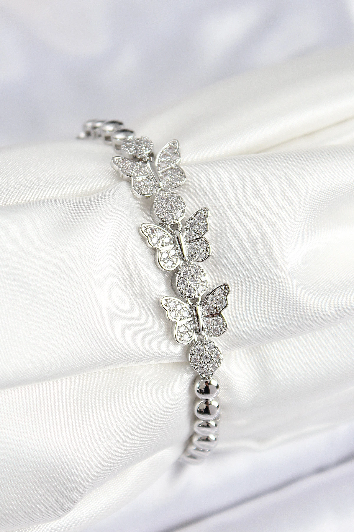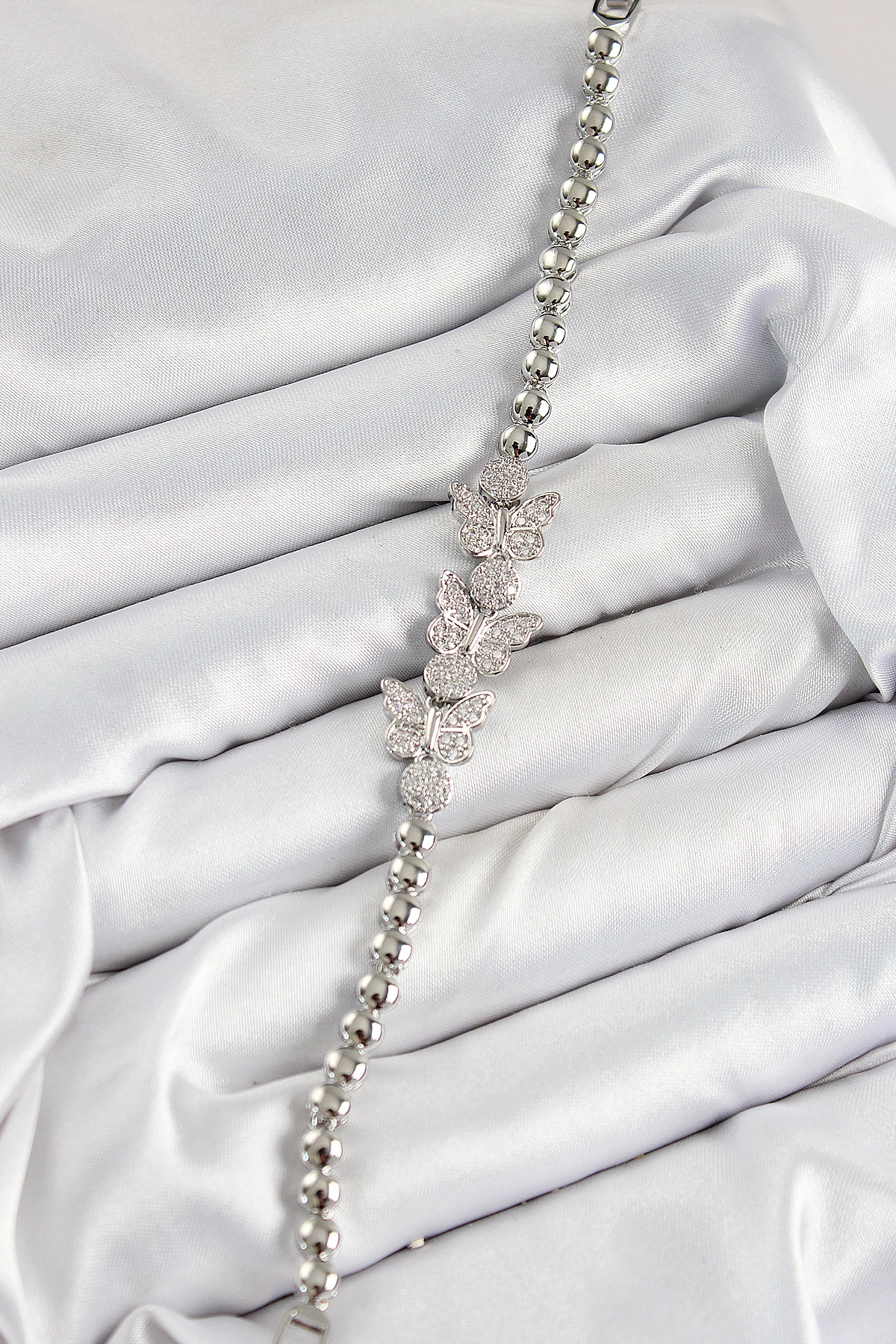 Pirinç Zirkon Taşlı Kelebek Model Gümüş Renk Kadın Bileklik