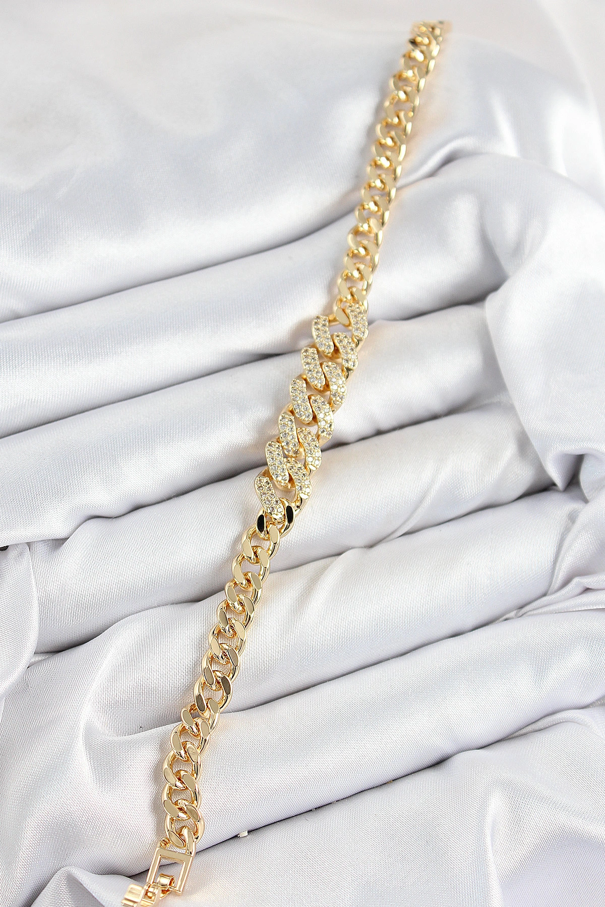 Pirinç Zirkon Taşlı Küba Zincir Model Gold Renk Kadın Bileklik
