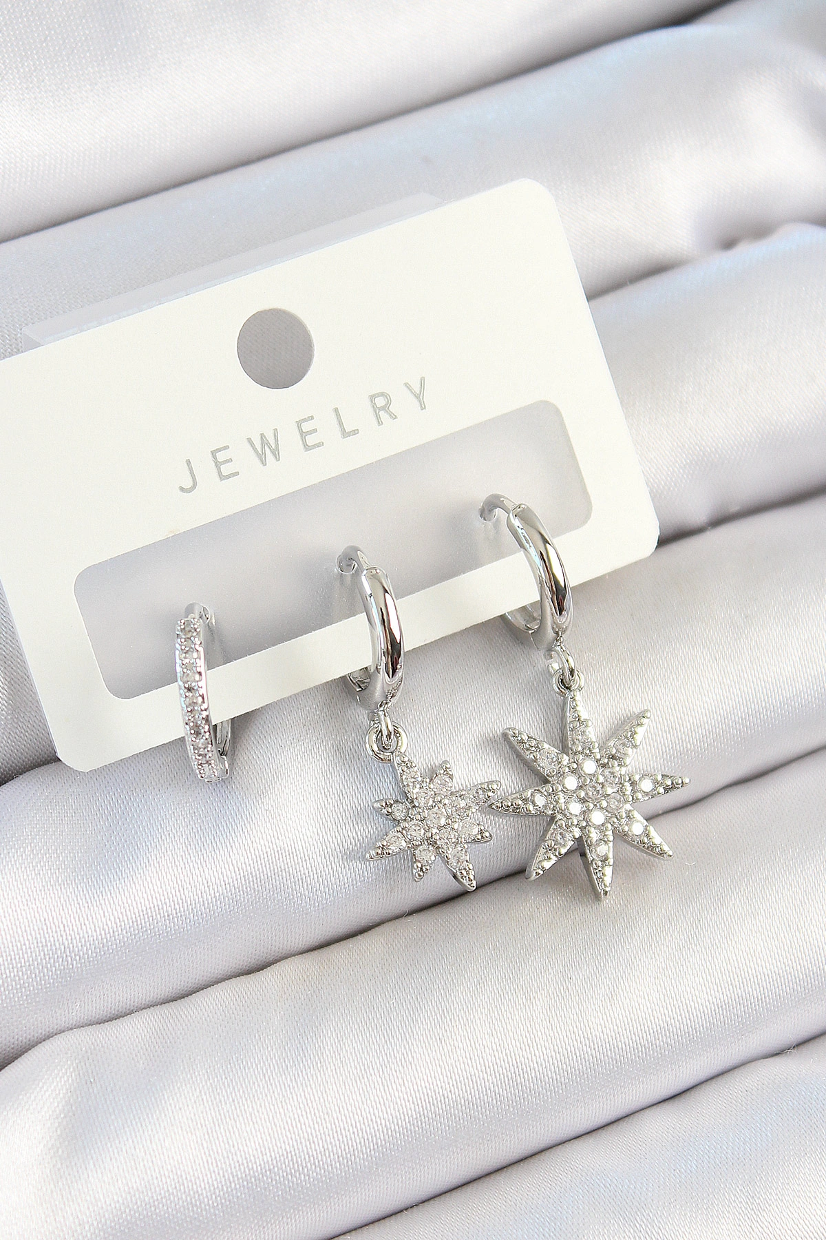 Pirinç Zirkon Taşlı Kutup Yıldızı Model Gümüş Renk 3'lü Çift Kadın Küpe Set
