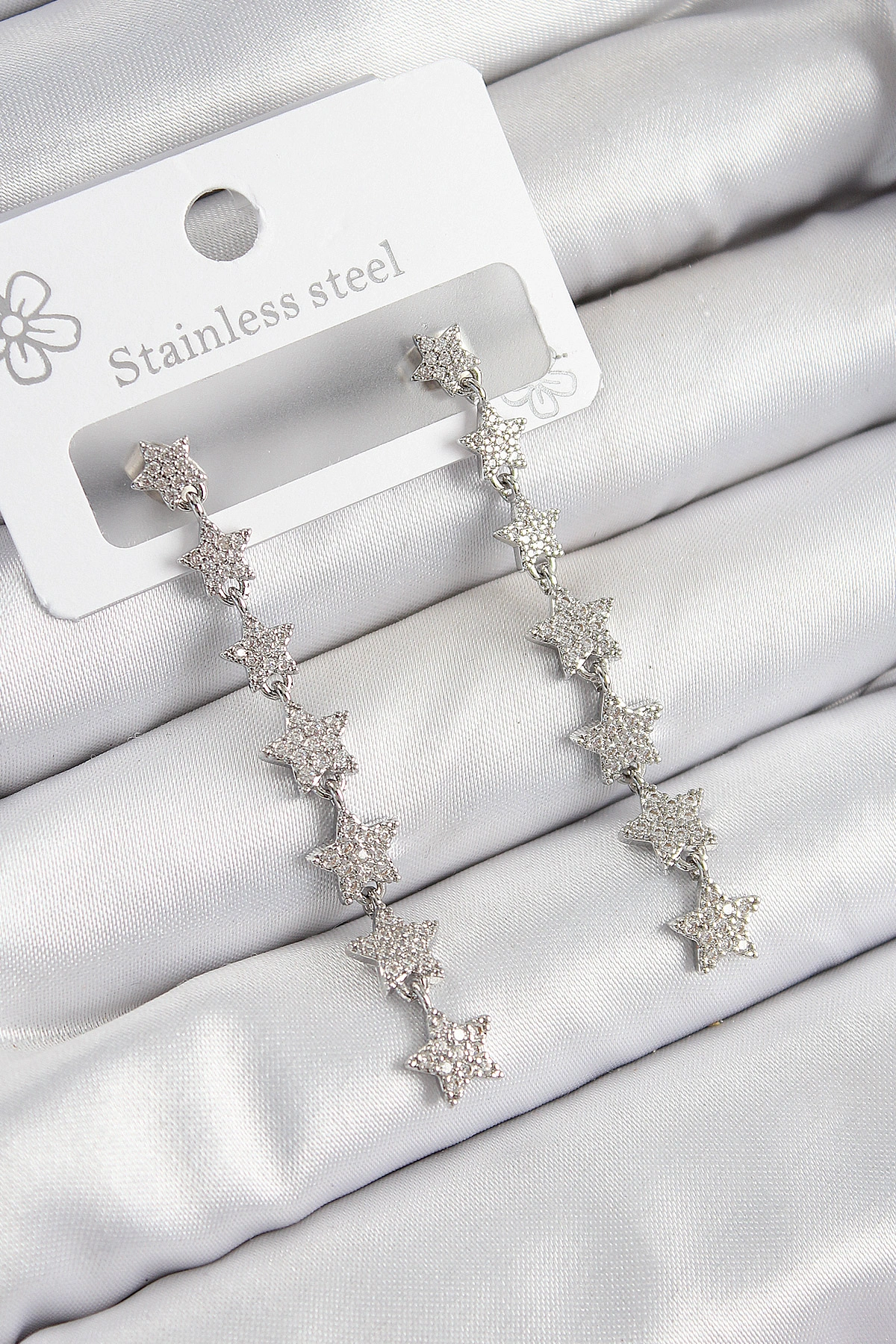 Pirinç Zirkon Taşlı Sallantılı Yıldız Model Gümüş Renk Kadın Küpe