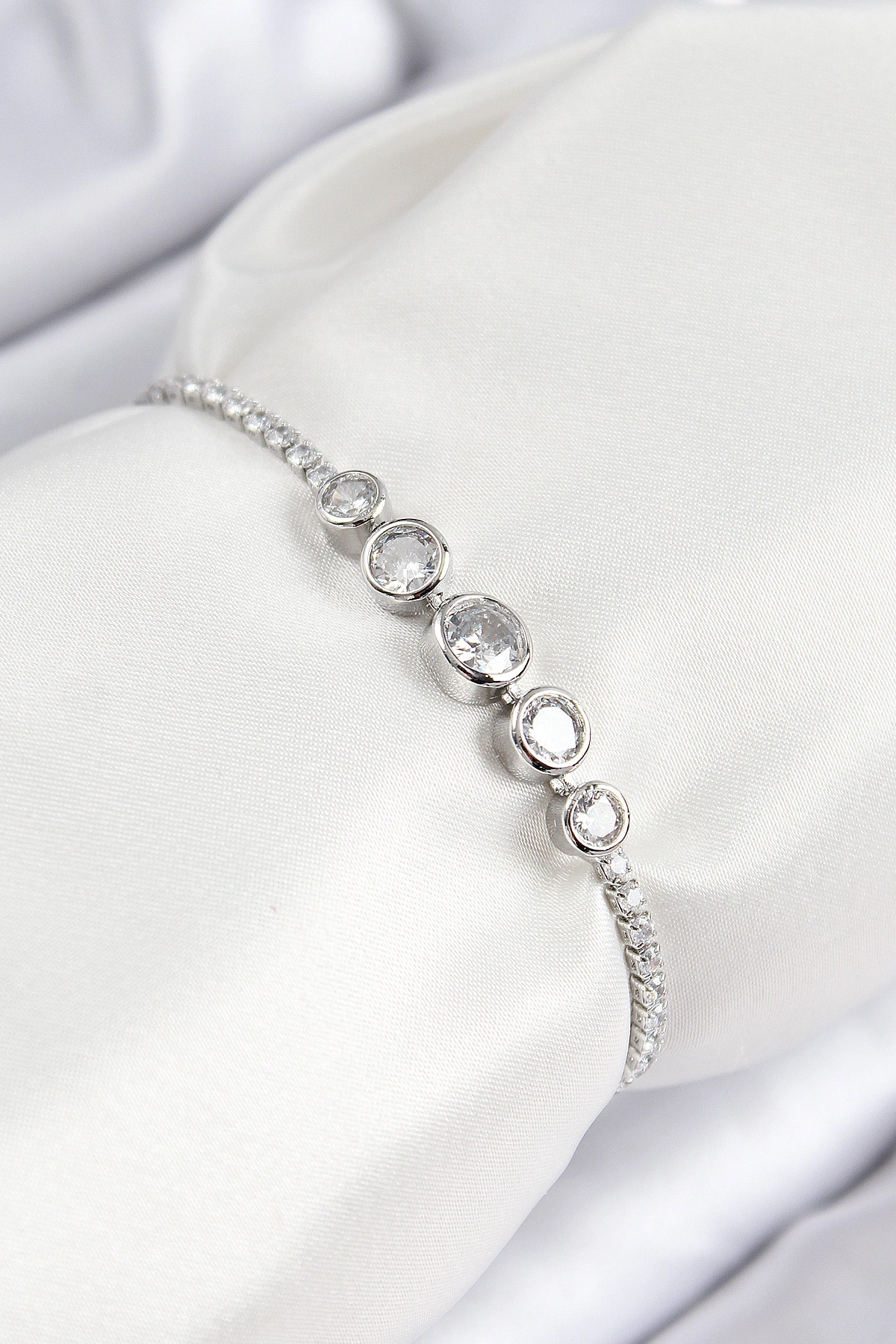 Pirinç Zirkon Taşlı Sıralı Daire Model Gümüş Renk Asansörlü Kadın Bileklik