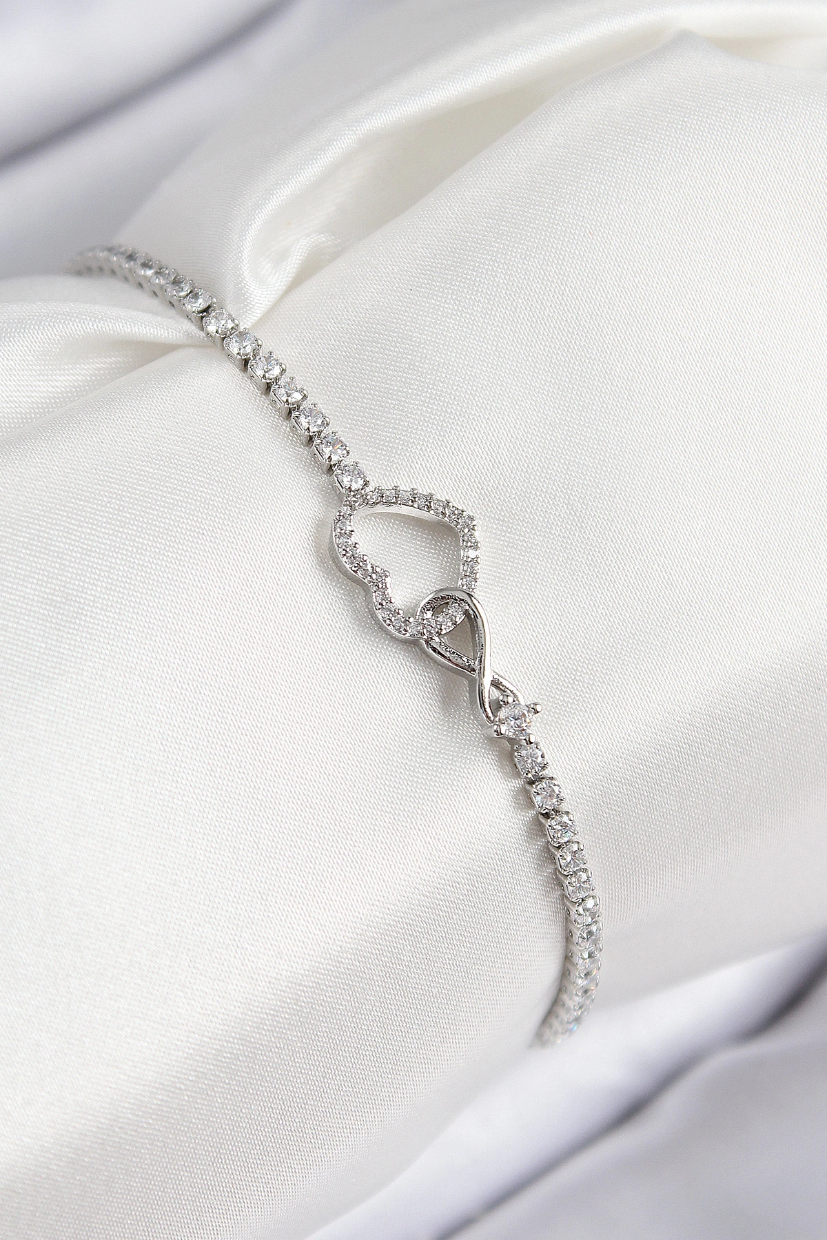 Pirinç Zirkon Taşlı Sonsuzluk Kalp Model Gümüş Renk Kadın Bileklik
