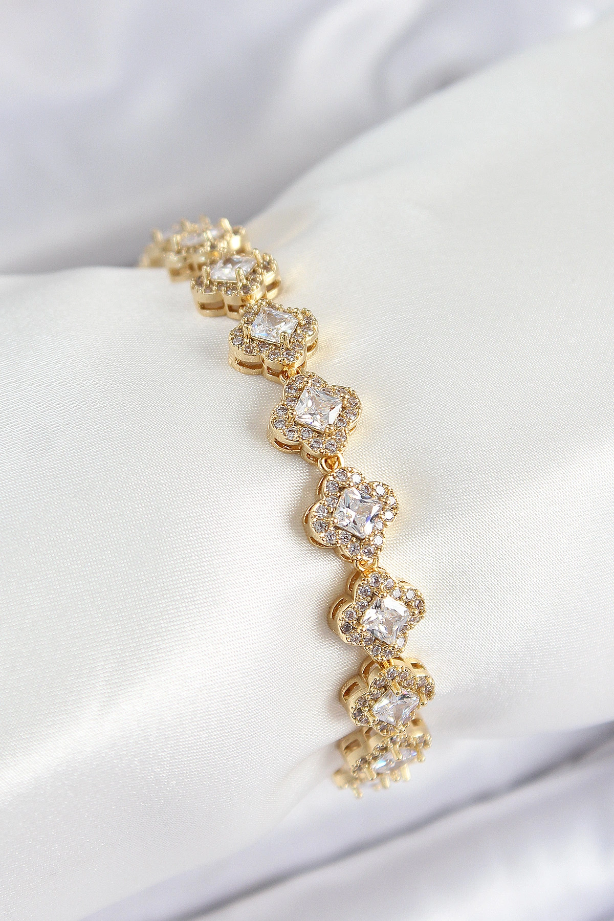 Pirinç Zirkon Taşlı Yonca Baget Model Gold Renk VIP Seri Kadın Bileklik