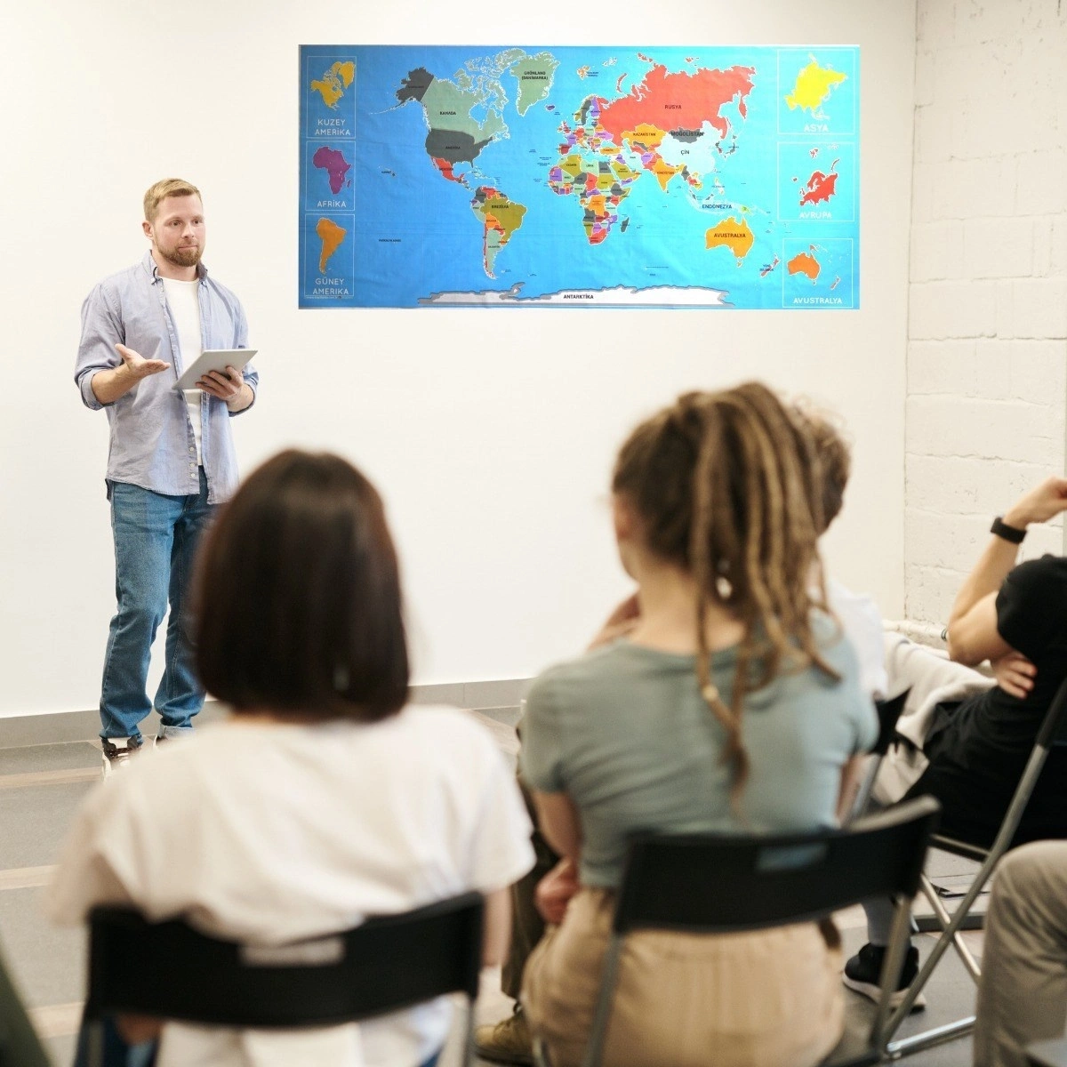 Ofisinizin duvarında kullanabileceğiniz üzerinde işaretlemeler yapabileceğiniz Dünya haritası.