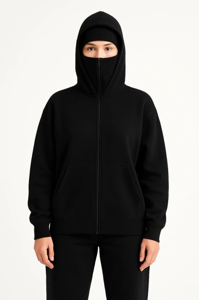 Samuray Ninja Çift Kapşonlu ZIP Fermuarlı Kanguru Çepli Hoodie Maske Detaylı Swetshirt - Siyah