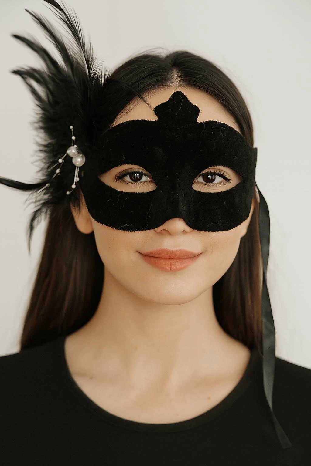 Siyah Renk Yandan Tüylü Süet Kaplama Beyaz İncili Parti Maskesi, balolar, maskeli partiler gibi özel günlerde gizemli ve göz alıcı bir görünüm elde etmek isteyenler için mükemmel bir seçimdir. Yumuşak süet kaplaması ve zarif beyaz incileri ile bu maske sizi partinin yıldızı yapacak.